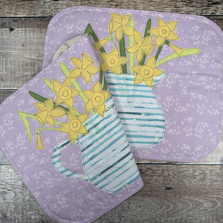 10. Spring Daffodils Placemat Set (March 2025) – Daffodils are commonly associated with Easter here in the US, and these darling daffodil placemats from Debbie von Grabler-Crozier would look so pretty at Easter dinner. Made with fat quarters and fat eighths, these placemat sewing patterns are centered around a striped jug filled with spring daffodils. This applique project is sure to brighten up your dining room table, especially when paired with a bouquet of fresh daffodils.