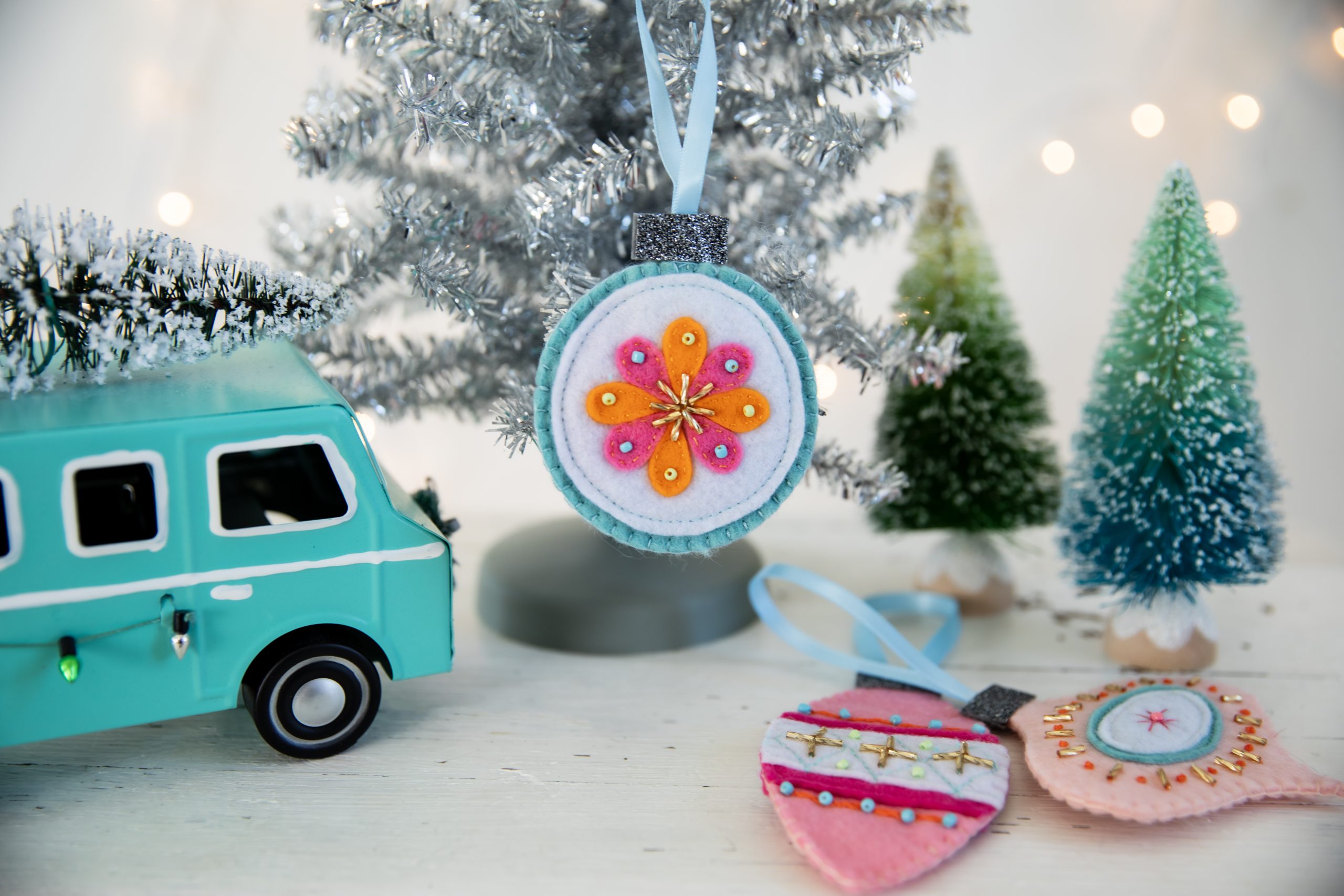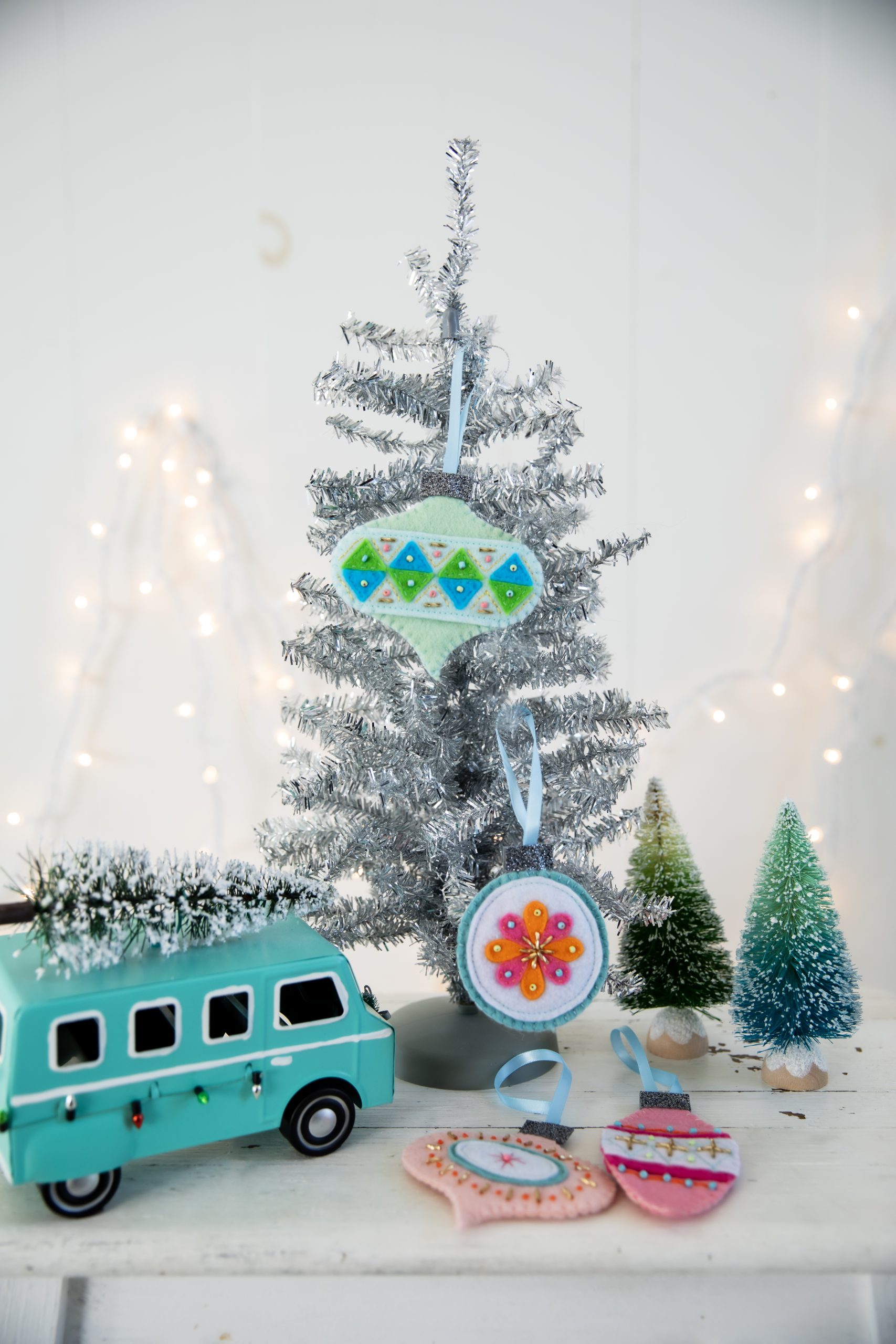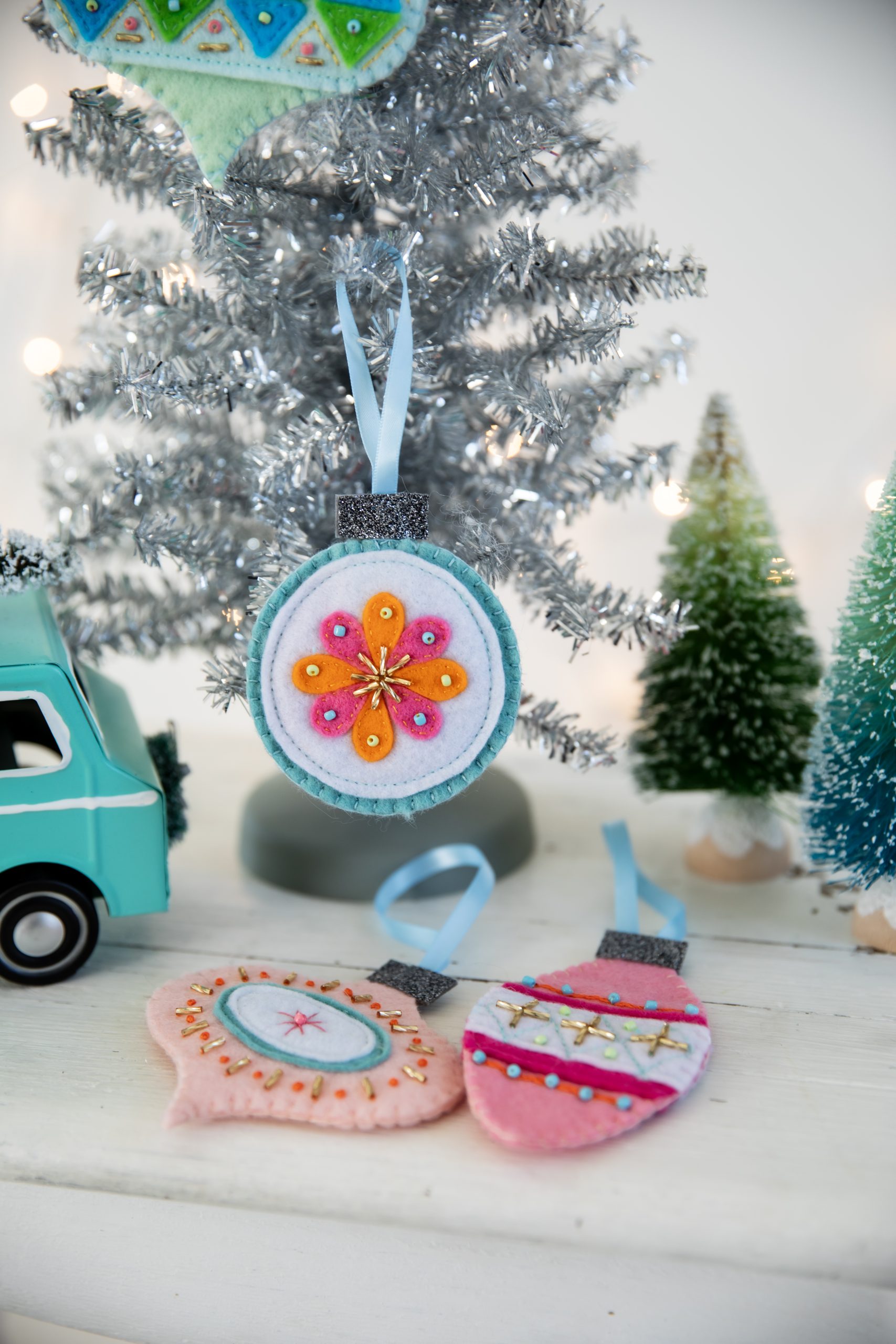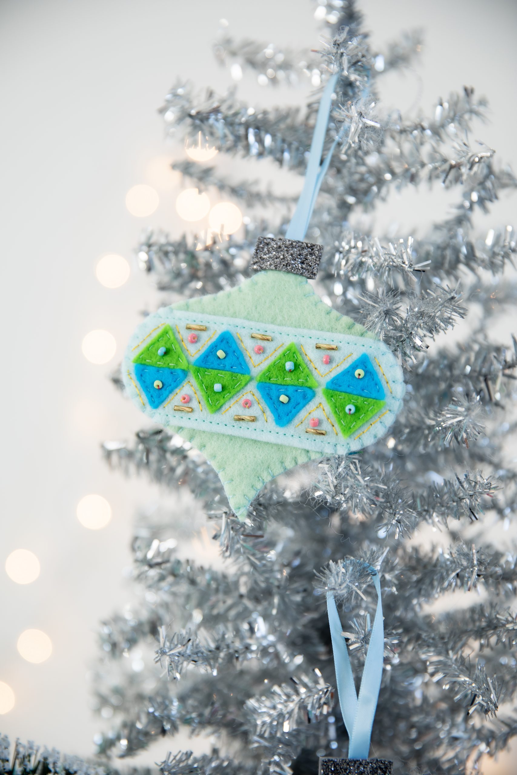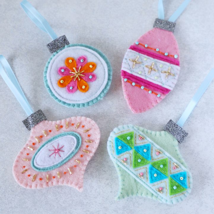 If traditional red and green isn’t your thing, don’t miss this set of playful, colorful ornaments from Sophie Tarrant. Inspired by Mid-Century Christmas décor, this set of 4 sewn ornaments is made from felt in an array of cheerful pastels and is completed with delicate seed and bugle beads and ribbon loops. Who needs boring, store-bought ornaments when you can add some major personality to your Christmas tree with these ornament sewing patterns.