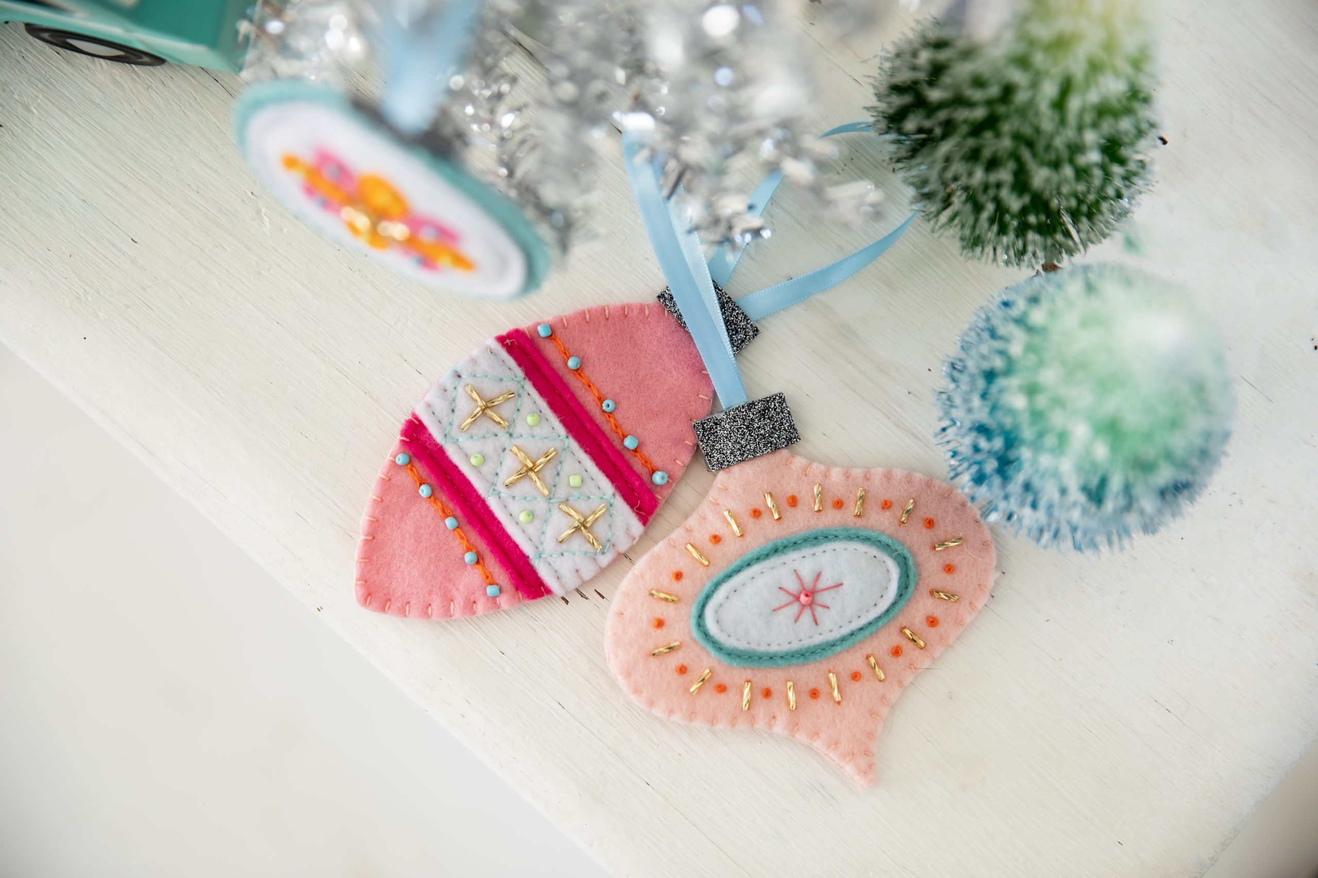 - Place each design together in its matching pair, with the right sides facing out and the edges aligned. Work a blanket stitch around the outside of each pair using two strands of a matching colored thread. Make sure to leave the very top of each one open by about 1/4 inch. Cut four 8 inch lengths of ribbon and fold each in half. Insert the raw ends of each ribbon into the gap at the top of one of the ornaments, then stitch across to close the hole and secure the ribbon. Finally, cut eight 3/4 inch × 1/4 inch pieces of gray glitter felt and place them in pairs around the top of each ornament, to cover the ribbon insertion points. Glue these into position to finish.