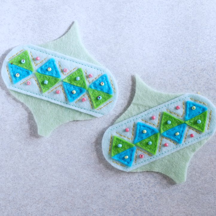 - Add the extra details to both Design Two pieces. Begin by stitching lines of gold backstitch around the edges of each triangle. Then, attach a green seed bead to each blue triangle, and a blue seed bead to each green triangle. Stitch a pink bead into each space between the triangles, then finish with a gold bugle bead above each pink one. Your Design Two pieces are now complete.