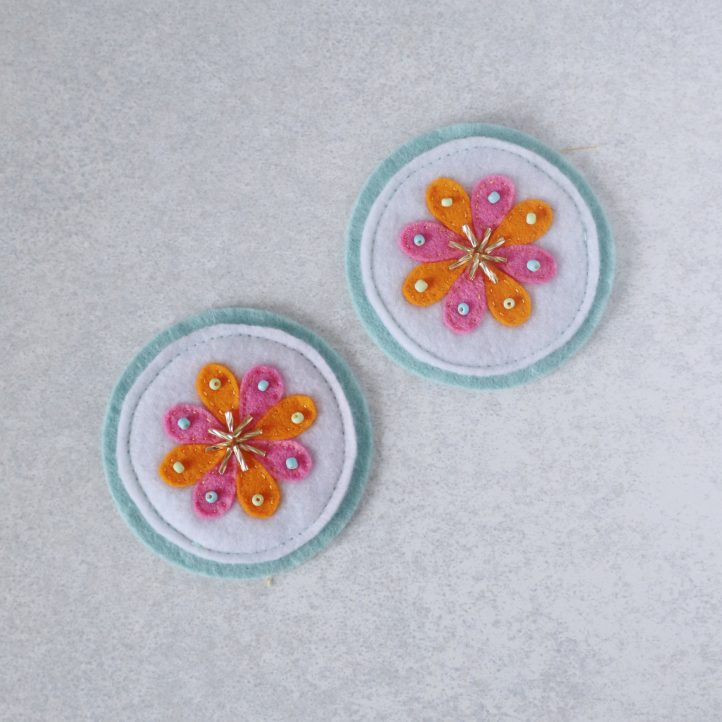- Add beads to your Design Three pieces. Secure eight bugle beads in the center of each to form a star shape. Then, stitch a green seed bead onto each orange petal and a blue seed bead onto each pink petal. Your Design Three pieces are now complete.