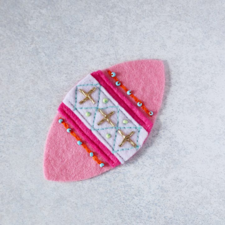 - Thread an embroidery needle with two strands of bright orange floss and work a French knot in between each of the bugle beads you just added. Then, use long straight stitches to embroider a star at the center of each piece. Finally, return to your beading needle and add a hot pink seed bead to the center of each star. Design One is now fully decorated.