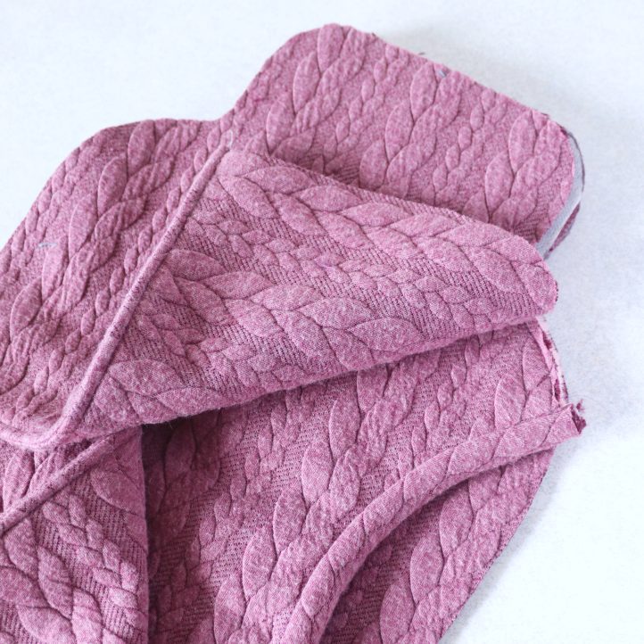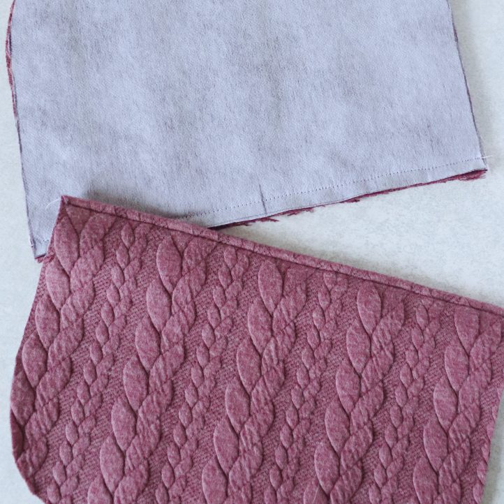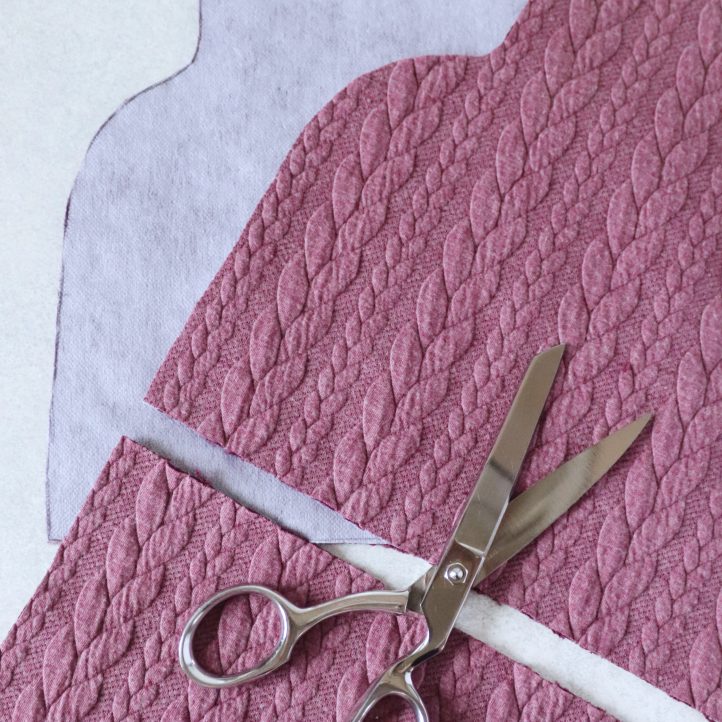 1. Start by downloading and printing the templates. Back your cable knit fabric with lightweight fusible knit interfacing – this not only makes it easier to draw and cut your pieces, but also adds extra strength and heat protection to the cover. Use the templates to cut the following from your cabled fabric: two front pieces, two of each back piece (upper and lower), and one pocket piece.