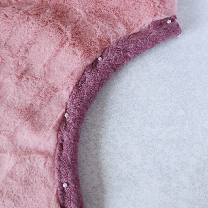 3. To make the pocket, cut a second pocket piece from faux fur fabric and place it wrong sides together with the cabled pocket piece, aligning the edges. Cut two 4 inch x 12 inch strips from your cable knit fabric and fold each in half lengthwise, with right sides out. With the cabled side of the pocket facing up, pin each strip along one of the curved sides, matching the raw edges of both the fabric and the strip. Stitch in place with a 1/2” seam allowance. Wrap each strip around to the furry side of the pocket, then pin and hand stitch to secure.