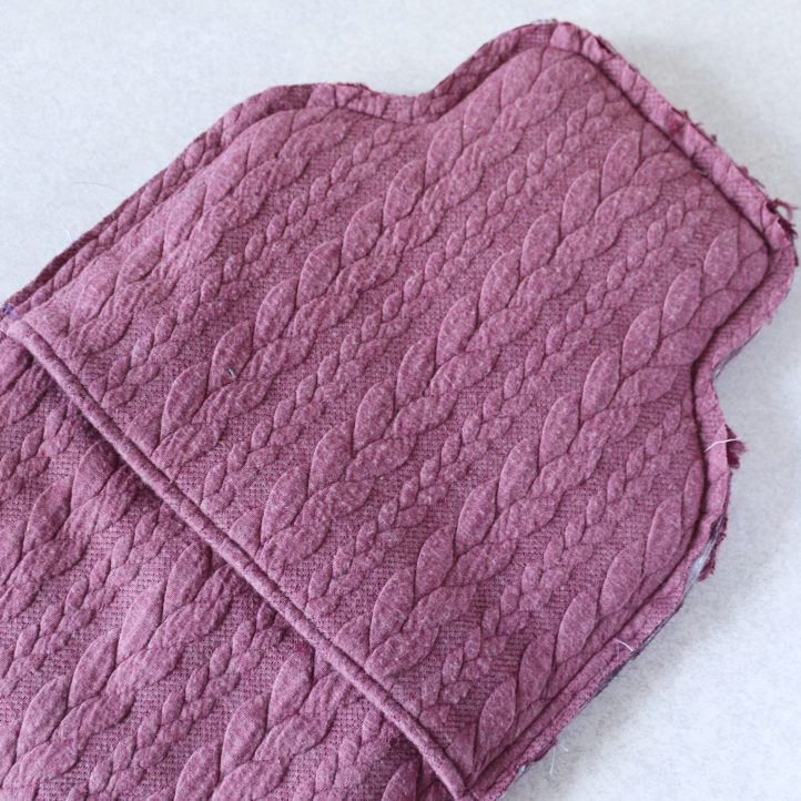 5. Finish your cover by stitching all around the outer edge, working through all the layers with a 1/2 inch seam allowance. Trim the seam to 1/4 inch and clip into the curves to help the cover turn over neatly. Turn the work right sides out, shaping the corners as needed. Slip your hot water bottle inside – and you’re done!