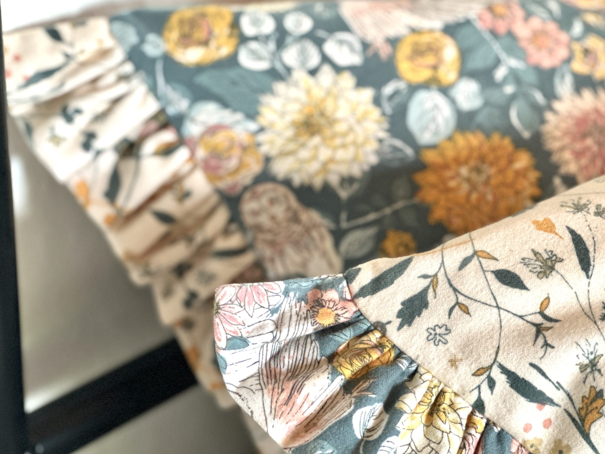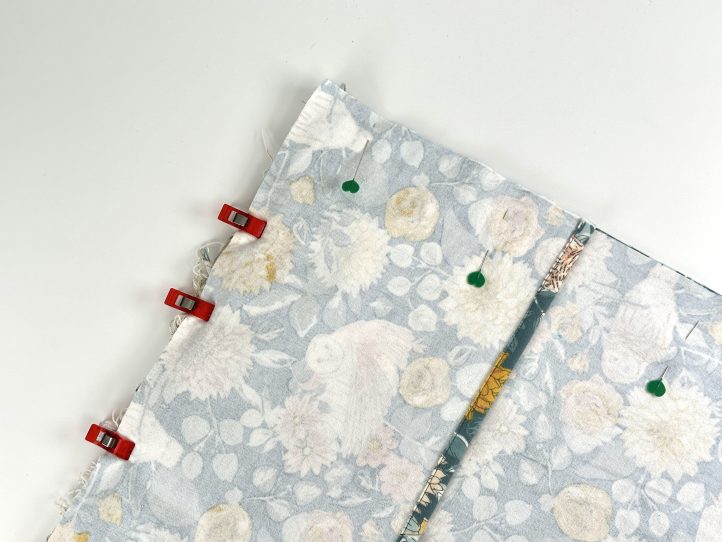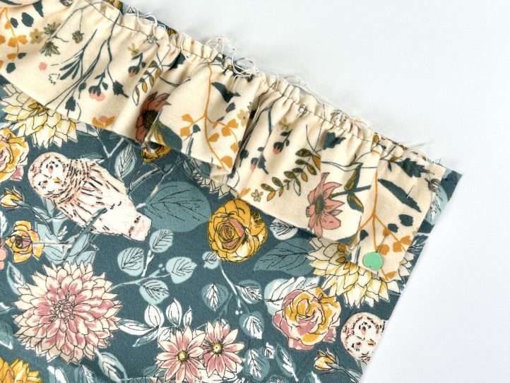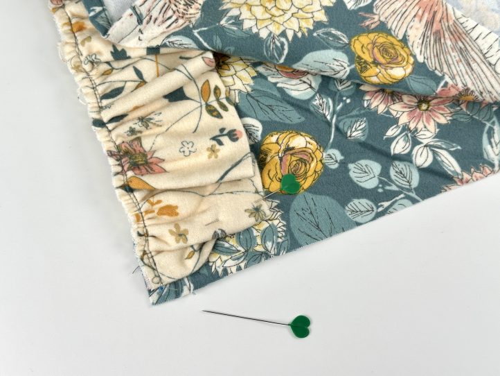 - Pin or clip the back panel to the front panel with the ruffles and tuck the ruffles in on the side. The right sides will be together. TIP: Make sure that any directional prints are the right way up.