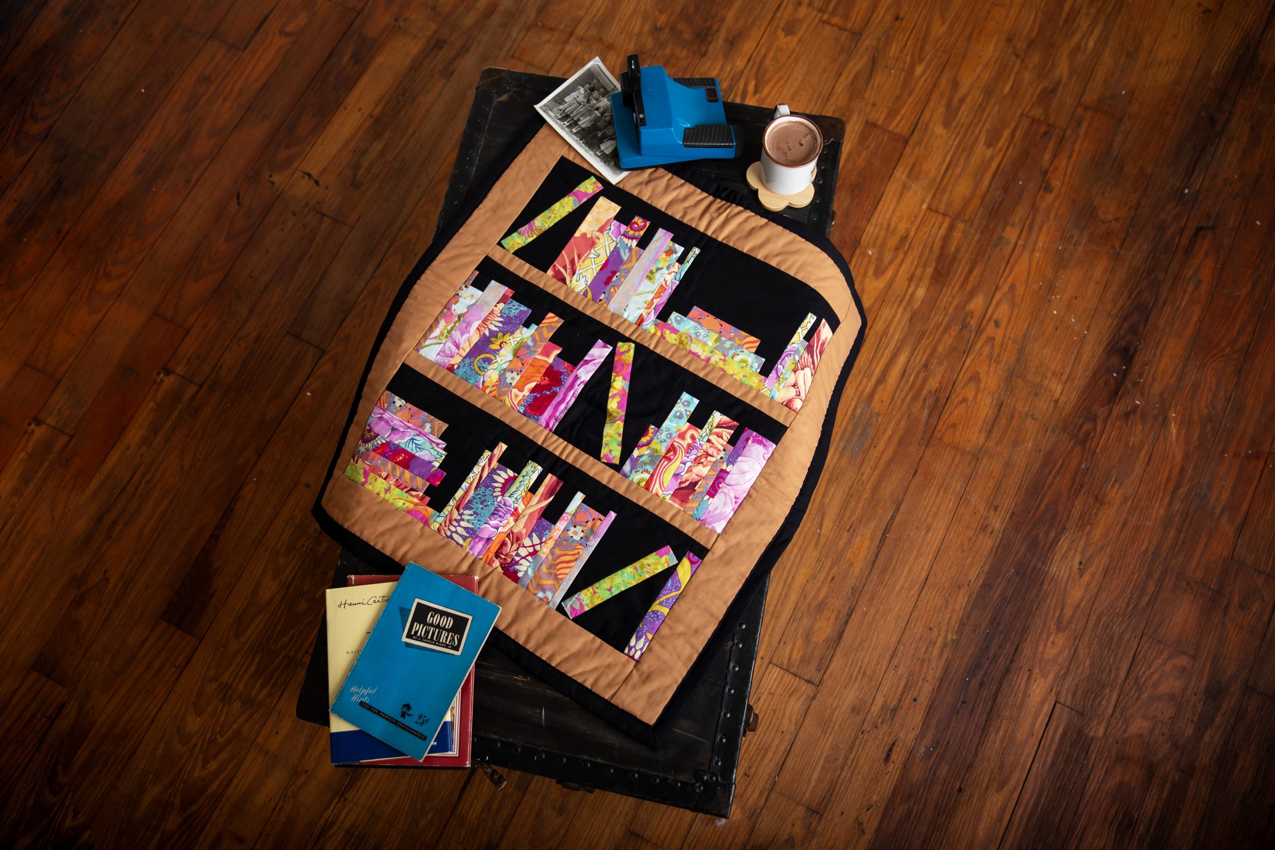We have to admit: we’re obsessed with this pretty bookshelf wall hanging! A fantastic way to use up printed fabric scraps, this quilted wall hanging is easy to customize and features three bookshelves against a moody black and brown background. Add special details to your books, such as embroidery on the binding, to give your wall hanging a thoughtful, creative finish.