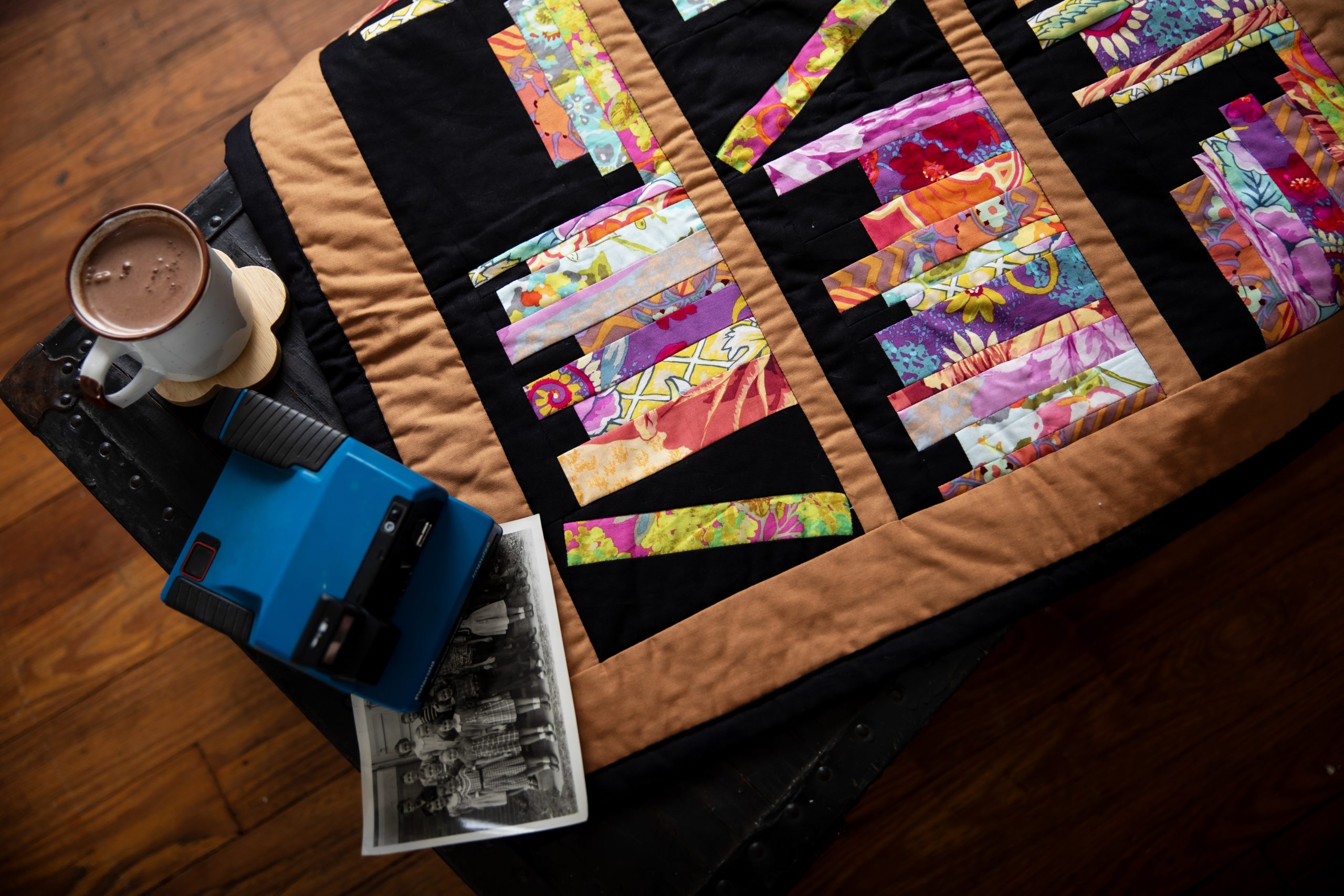 - With your quilt top complete, it’s time to layer and quilt. Lay the finished top over a piece of quilt wadding that’s at least 1” larger than the quilt top on all sides. Place this onto a 28” square of black backing fabric, with the right sides facing out. Pin the three layers together. Using black thread and a 2.6mm (1/8”) straight stitch, quilt around the edges of each shelf block, working through all layers to secure them in place.