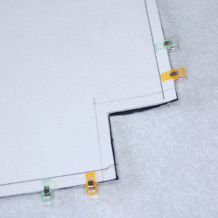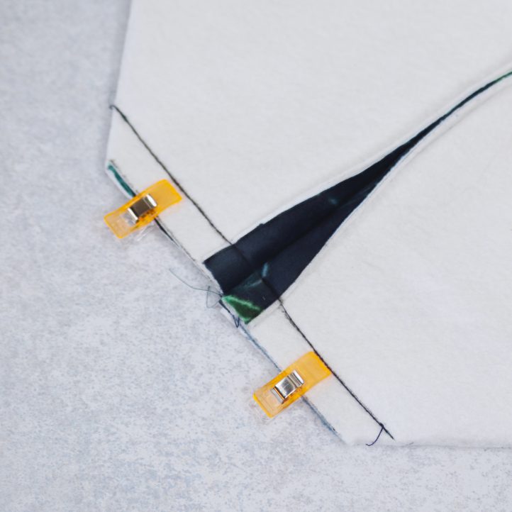 - Now it’s time to sew the gussets. Take one bottom corner and flatten it, so the side and bottom seams run down the center, and the gusset edges meet to form a straight line. Align the seams carefully, then clip into place. Machine stitch across the gusset with a 1/2 inch seam allowance. Repeat to sew the remaining gusset on the other side, then turn the bag right sides out.