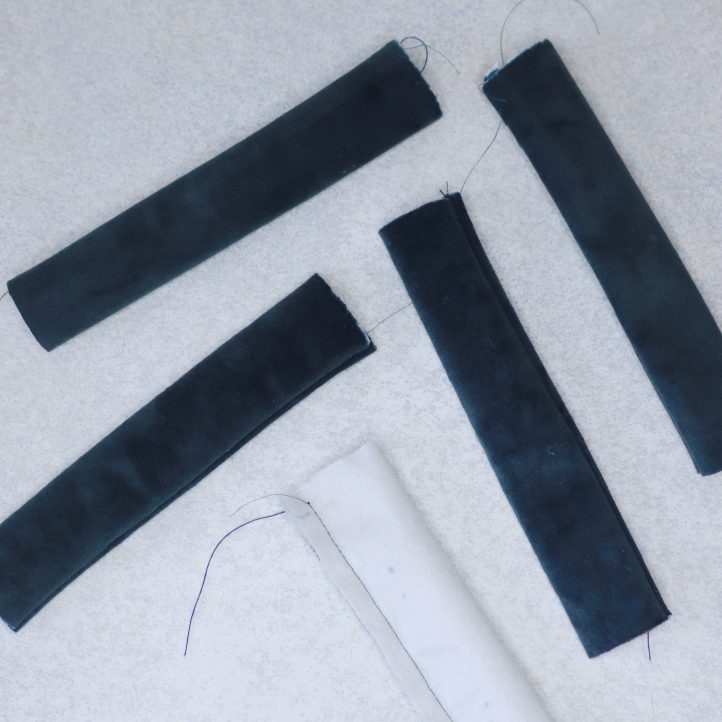 - Before you stitch your channels to your bag, you need to make some tabs. Cut six 3 inch x 6 inch pieces of navy velvet, then fold each one in half lengthwise with the right sides facing. Sew down the long edge of each one, leaving a 1/2 inch seam allowance. Turn each piece right side out and lay them flat, then roll them around slightly so the seam of each tab runs down the center of the strip.