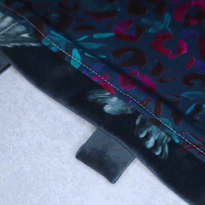 - Fabric: Patterned outer velvet, 1-1/2 yards (you may need more to match the print of the fabric); plain navy velvet, one fat quarter; lining fabric, one yard