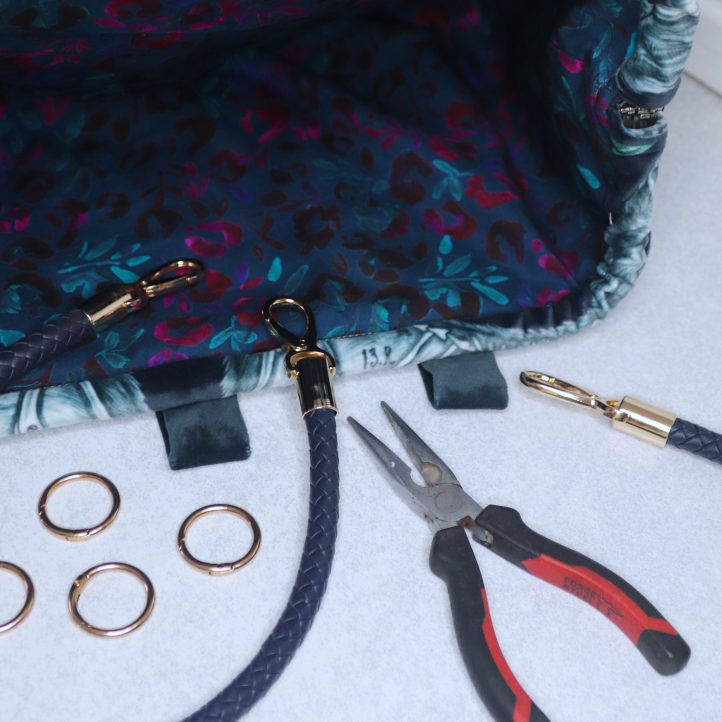 - It’s time to insert the metal bag frame. To take the frame apart, use a pair of pliers to gently squeeze the hinge on one side until the pin slides out. This might take a few tries – it can be tricky! Repeat to remove the pin on the opposite side in the same way. With the two halves separated, take one and thread it through one of the upper channels you made in Step 4, making sure it faces the correct way. Thread the other half of the frame through the second channel. Bring the hinges back together on each side of the bag, then gently squeeze each one with the pliers again to reinsert the pins and secure the frame back together. Ease the fabric into place around the frame until it sits neatly. Finally, thread a detachable gold O-ring onto each of the outer straps, then clip two bag straps onto them to secure them in place.