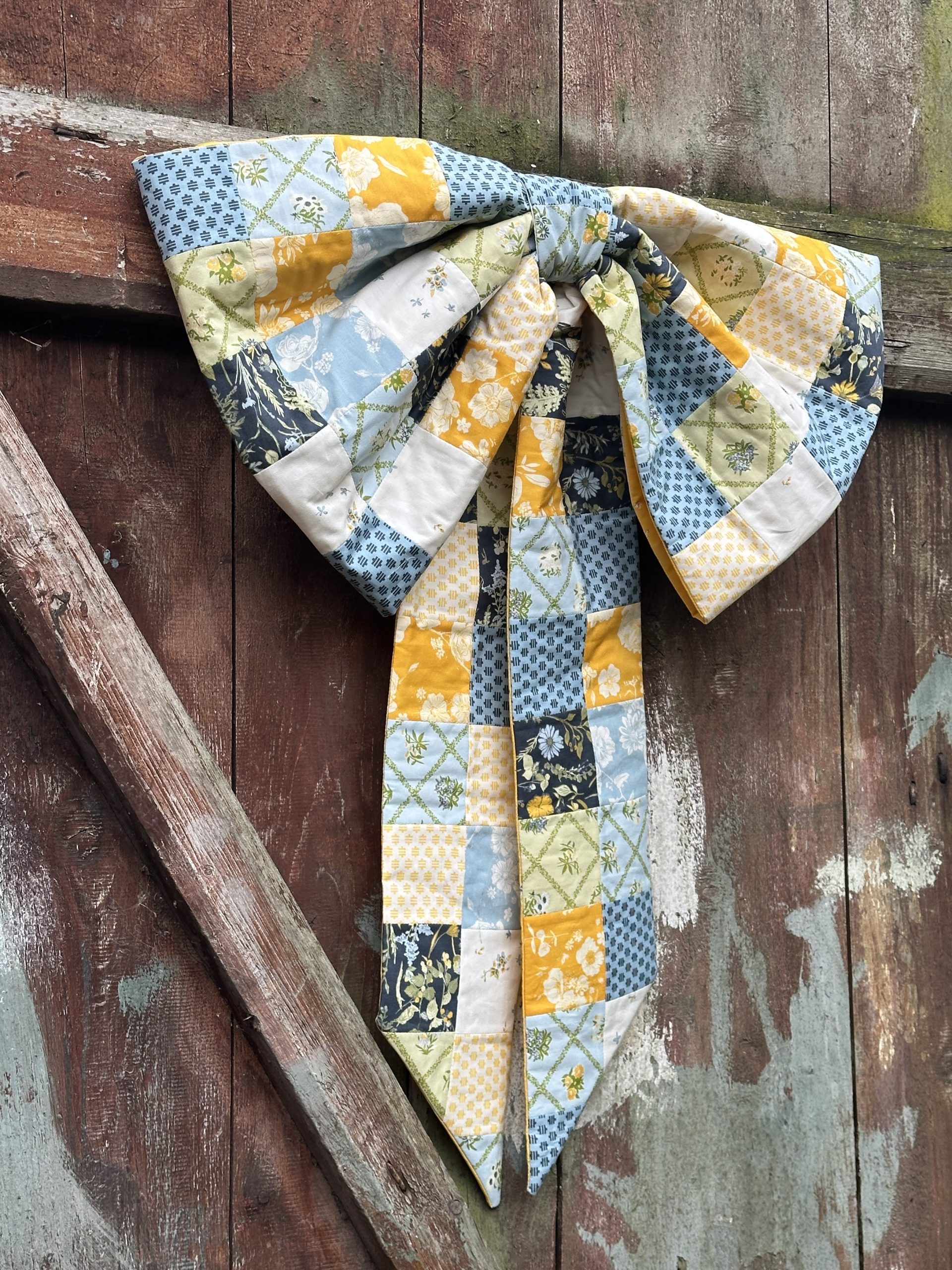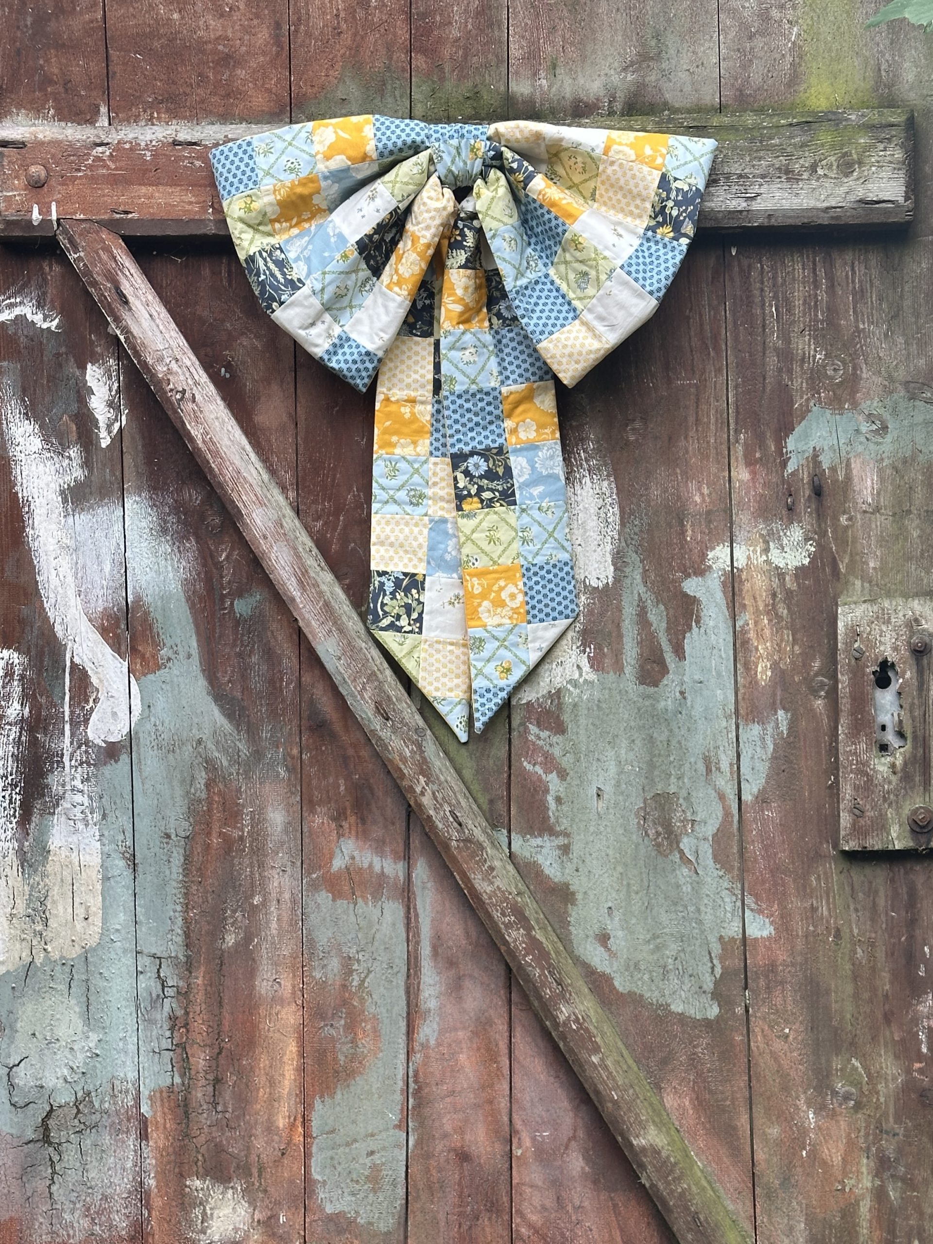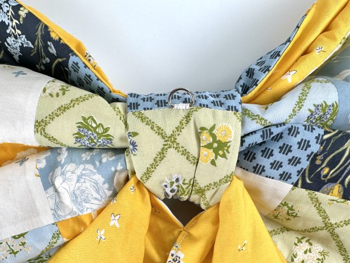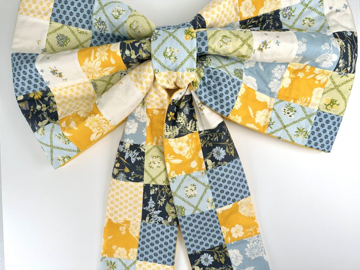 Welcome visitors to your home with a cheerful, playful patchwork door bow! New from Debbie von Grabler-Crozier, this fat quarter friendly project would look so pretty on your front door and features a small hoop or ring to easily display your design. Sew your door bow pattern in cheery fall blues and golds like the sample shown or in red, white, and green for the upcoming Christmas season.