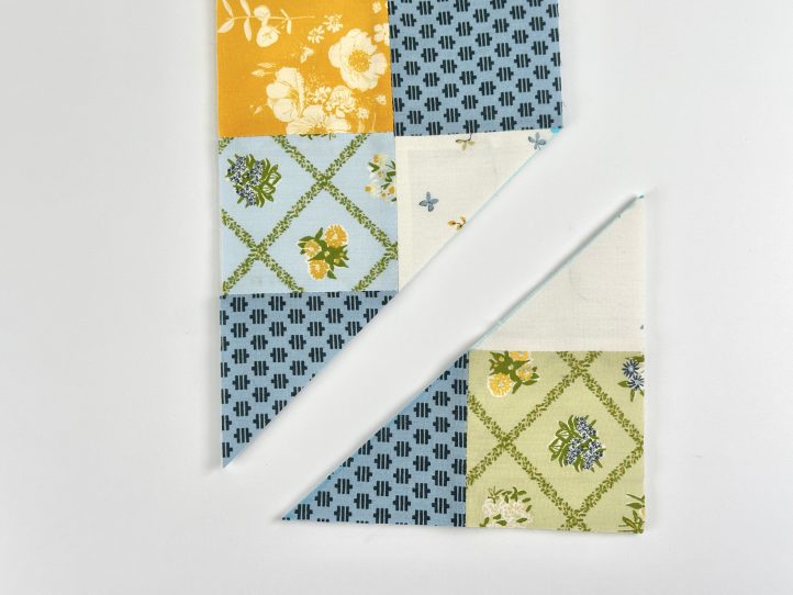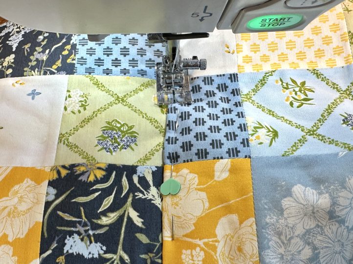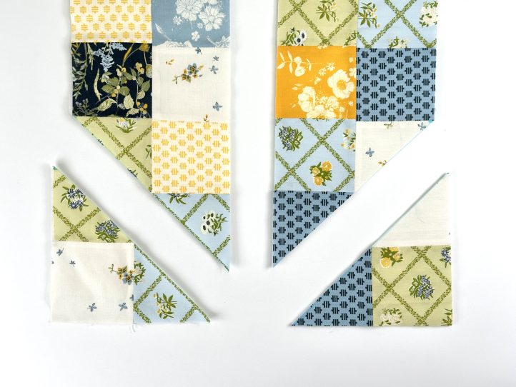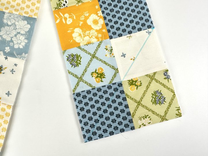 - Attach the squares to make a long strip, 2 squares wide and 20 squares long. Press and interface.