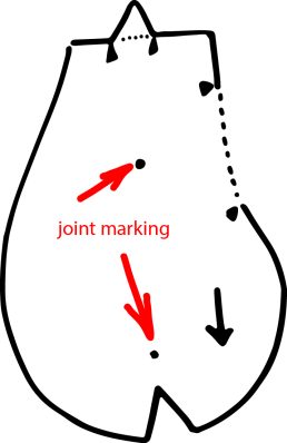 - With your awl, punch the joint marking hole on each leg and arm. Then, fold the legs in half, pin, and sew, leaving the top of the leg open as indicated on the pattern piece.