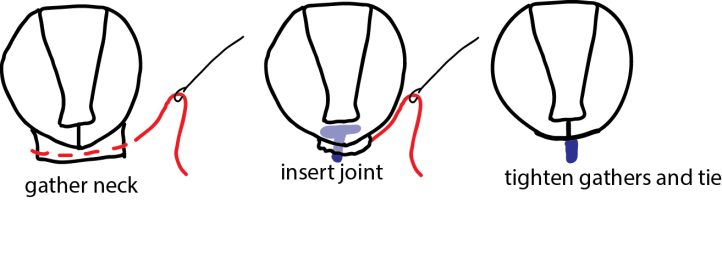 - Stuff your rabbit’s head. You’ll use more stuffing than you think! Make it nice and firm. With a strong thread, gather the neck opening. Place the flat end of your 25mm joint into the neck opening, and then pull the string tight. Knot your thread and clip the end. It’s important that the neck opening is closed very tightly around the stem of the joint. Trim the fur away from the stem about 1/4″.