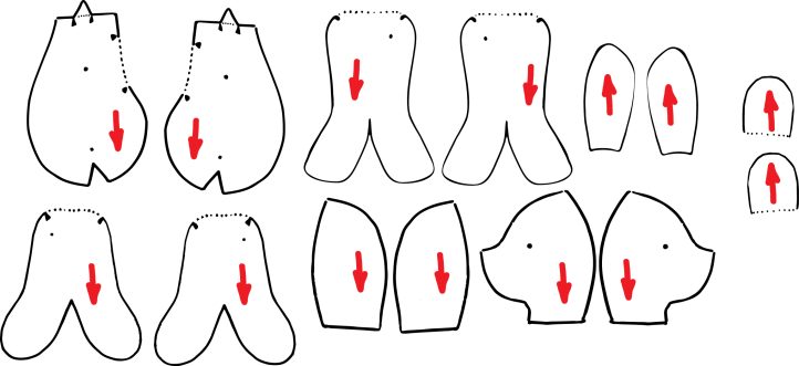 - Trace each pattern piece onto heavy cardstock, a plastic template sheet, or other heavy paper. Cut these out and, using an awl, punch the joint hole markings on the arm and leg. Be sure to mark the fur direction as well (shown with an arrow).