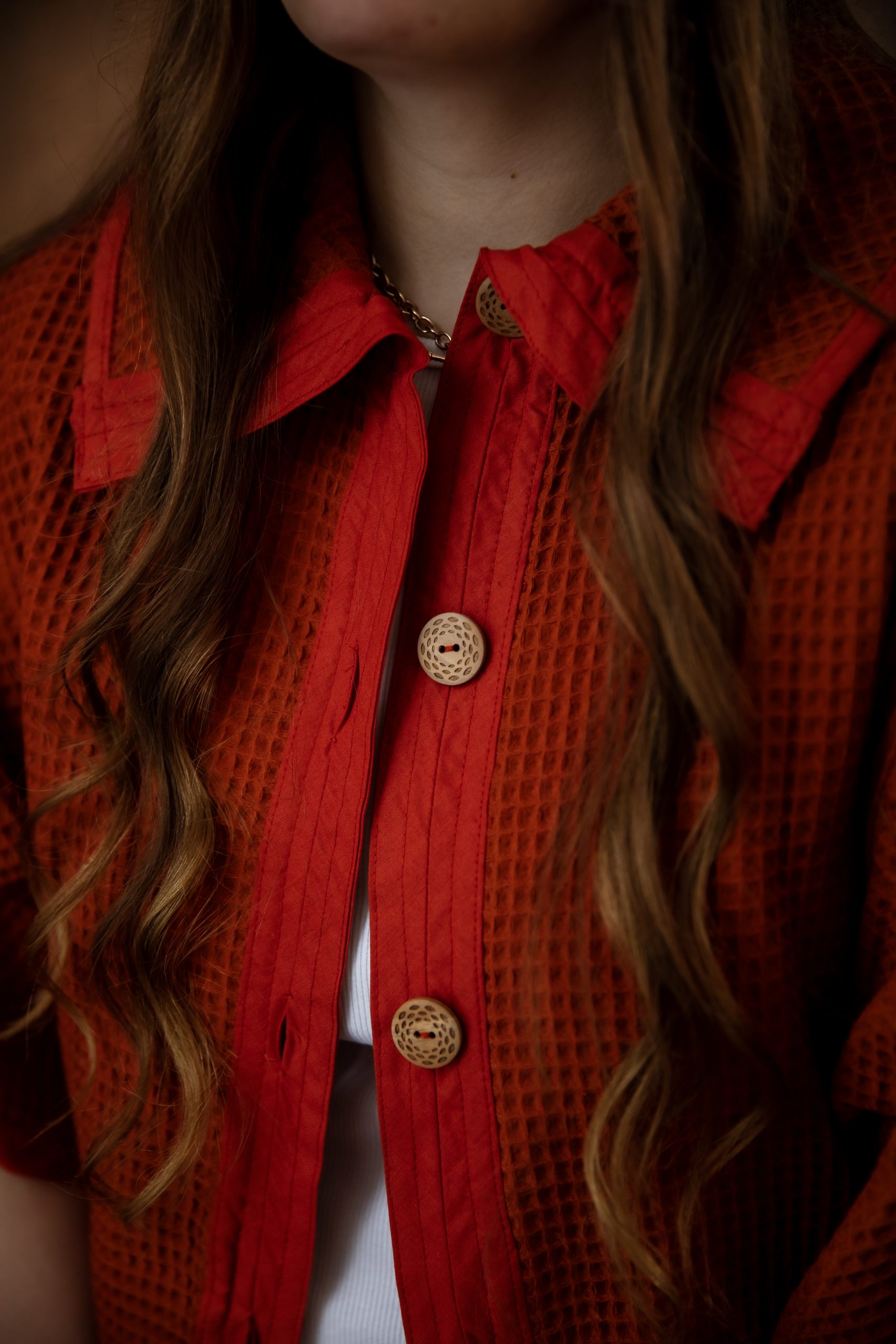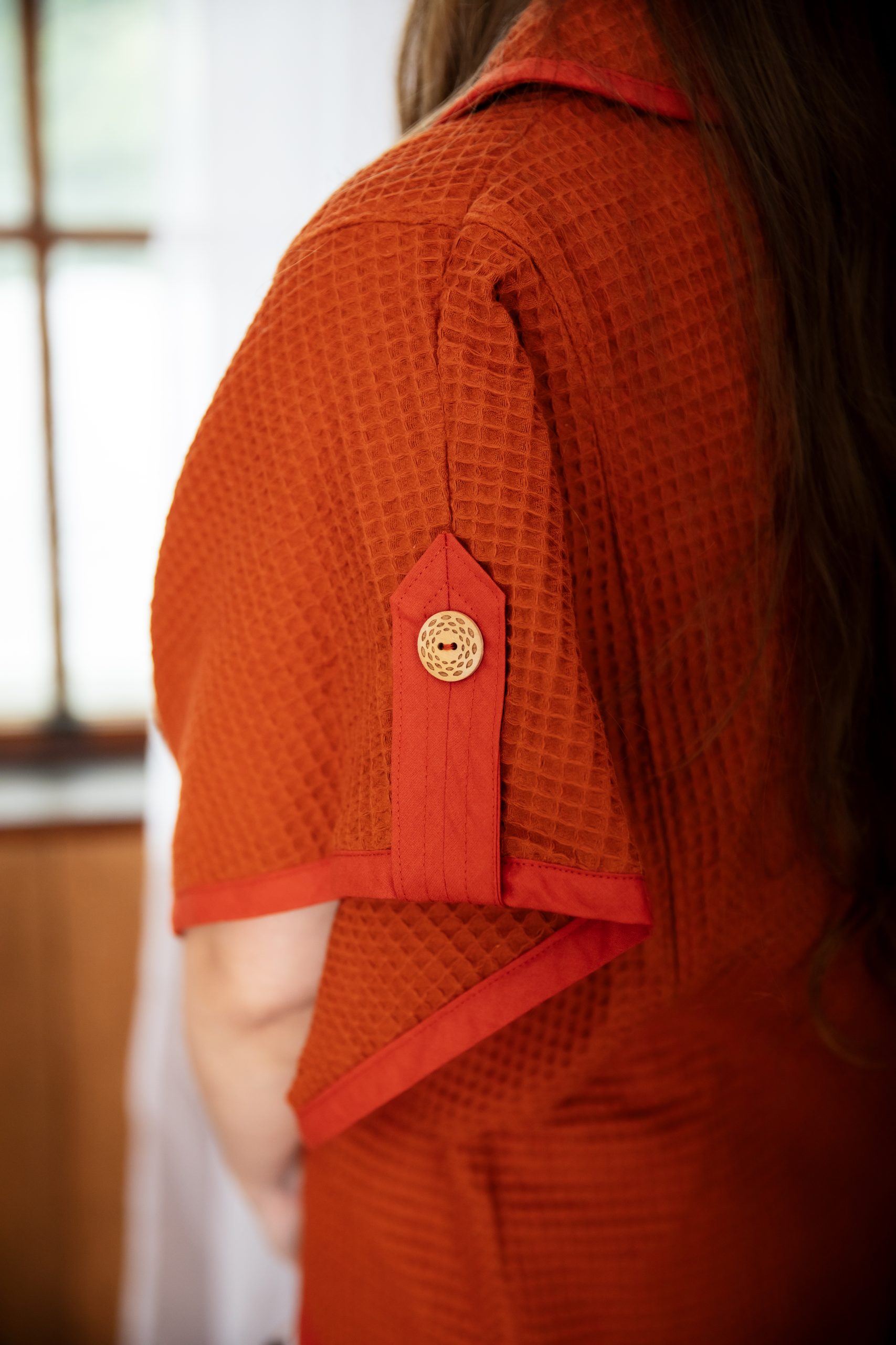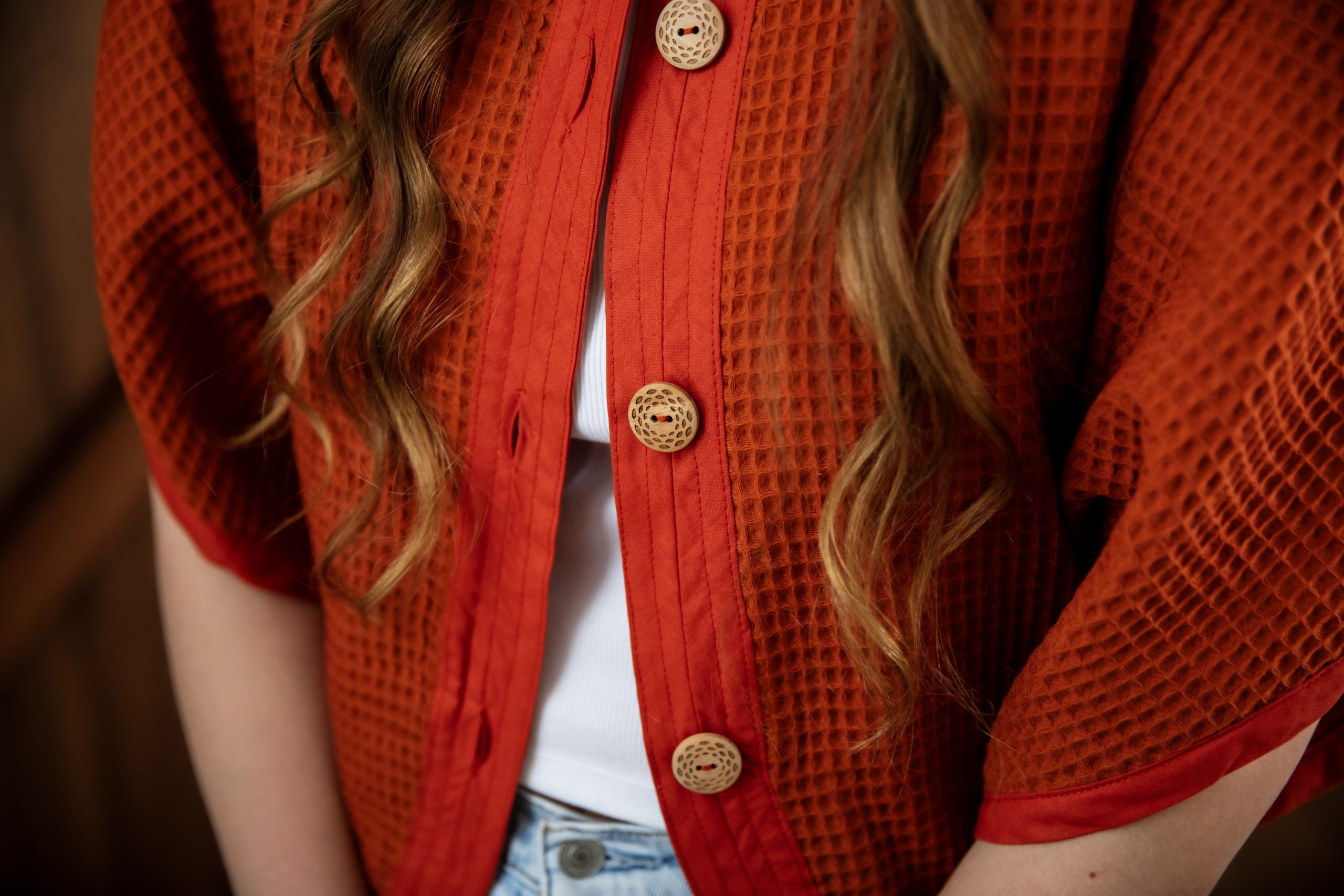 Note: For the model sample, Don used a cotton waffle cloth piqué and cotton poplin by Tula™ in terracotta; Vlieseline™ fusible stay tape; natural wooden buttons by Prym™ Gütermann™ Sew All sewing thread (terracotta).