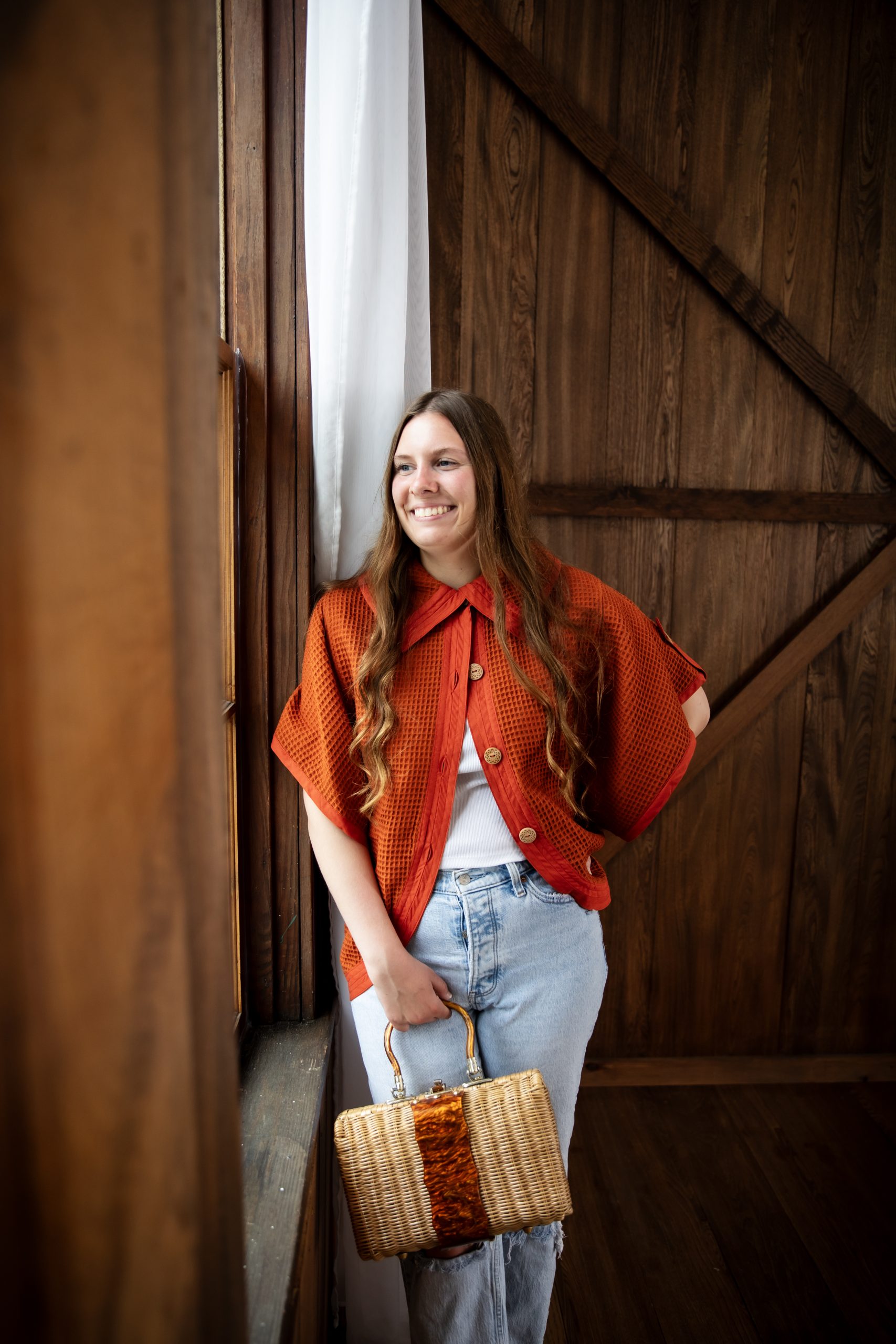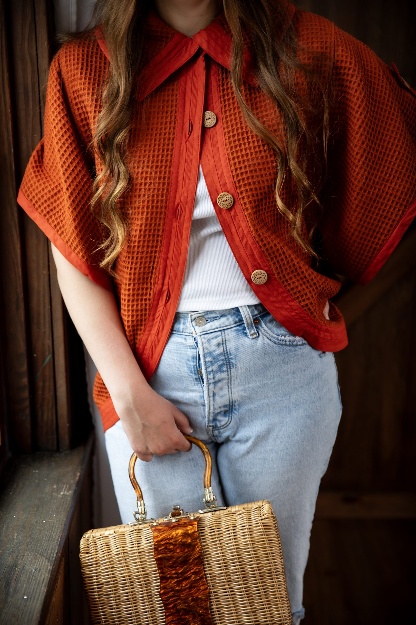 Update your fall wardrobe with a colorful statement sweater with this design from Don Morin. Made in textured waffle cloth in burnt orange, this polo sweater pattern has a bias-cut border and features roomy, kimono-style sleeves, making this pattern perfect for fall layering. Complete your sweater sewing pattern with large, stylish buttons and pair your top with your favorite pair of jeans and boots.