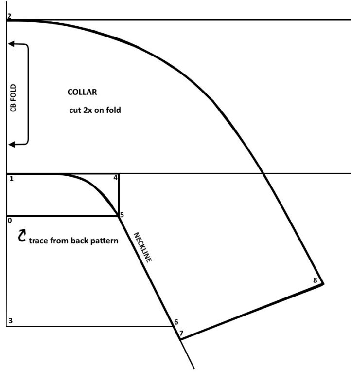 On folded paper, place CB (1-2) on fold and trace out 1-5-6-7-8-2. Add seam allowances. Cut out on the fold as a full pattern piece.