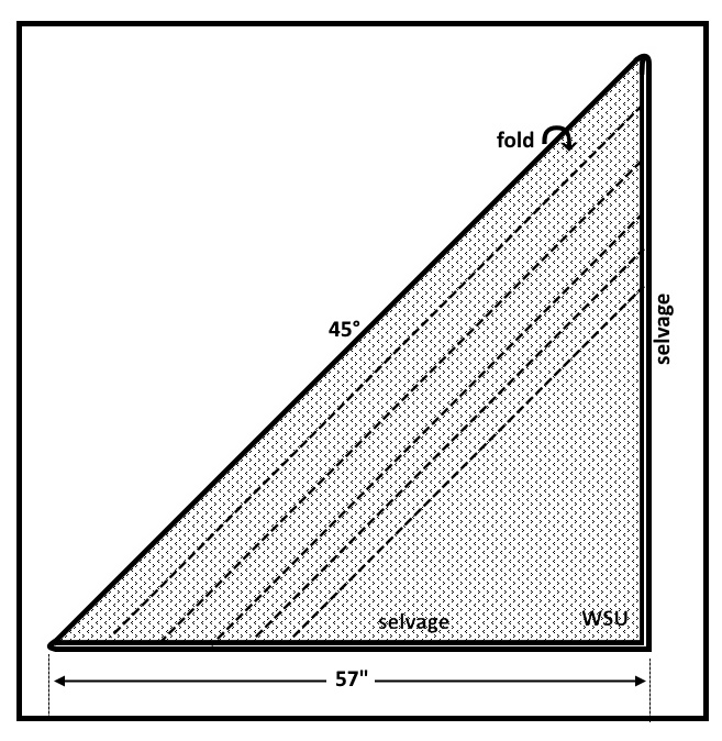 - With right sides together, fold one corner of the cloth over so the length-wise threads of the goods exactly parallel the cross-wise threads. The 45 degree angle that is created in the true bias of the cloth. Press the fold flat using an up and down motion so as not to stretch the bias grain. With the fabric remaining folded, use a yardstick and chalk-wheel to mark out 3 bias strips parallel to the folded edge. The width needed is 2 1/2” (6.4 cm) wide. Chalk ends of each pair of strips to distinguish the right and wrong sides of the material. These bias strips will be used for the border trim, sleeve openings, and sleeve tabs.