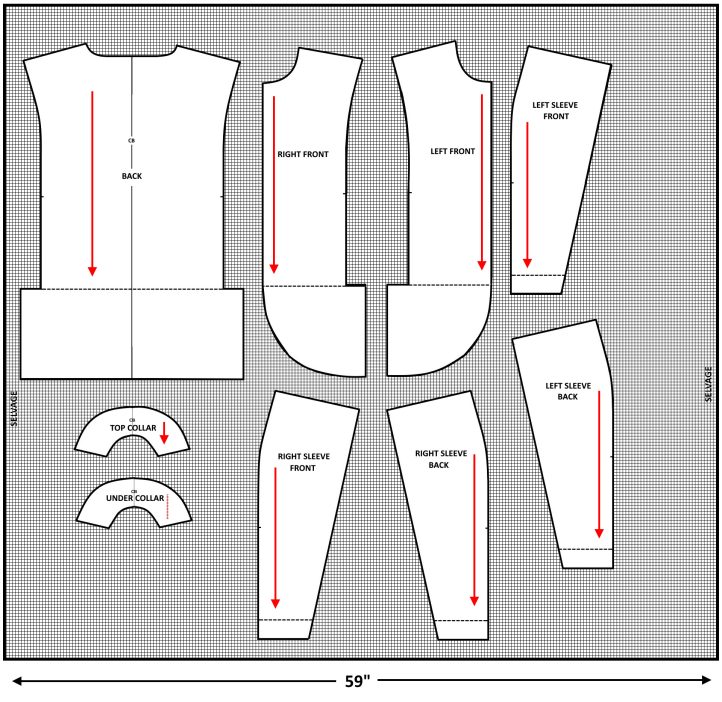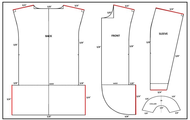 There are only two open seams in this garment: the shoulder and sleeve combination seam, and the side-seam and sleeve combination seam. Both require a major seam allowance to accommodate machine-stitching and seam finishes. Major seams (indicated in red) are typically double the width of the existing minor seam allowance, but feel free to select whatever is appropriate for your fabric’s characteristics.