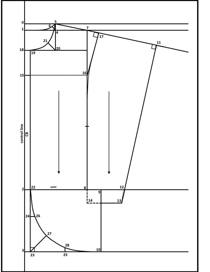Draw a smooth curve from waist (22) to side seam (10) passing through points 26-27-28, as shown.