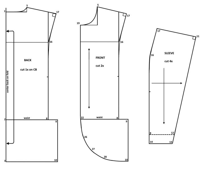 Sleeve: Connect the dots, 11-13-14-8-16-17-11. Add seam allowances*.