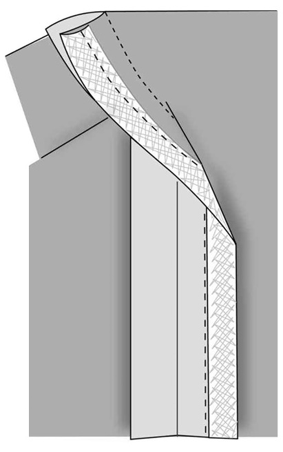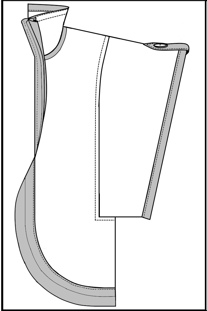 - Apply Border Trim to Body: Collect prepared bias trim. Starting at the CB of the garment with RST, align the joining seam to the center of the back hem and apply the bias trim around the perimeter of the garment. Pin the bias trim to follow the cut edge of the body. Ease the bias trim around the front curve and straight up the front edge to the top of the collar. Allowing for a turned edge at the top, extend the bias trim about 3/8” (10mm) beyond the collar and cut away excess material. Tailor-baste the seam allowance of the bias trim to the edge of the garment and remove the pins. Stay clear of the stitching line. Starting from the centerback of the garment, machine-stitch 3/8” (10mm) from the edge of the tape. Repeat method for other side of the garment.