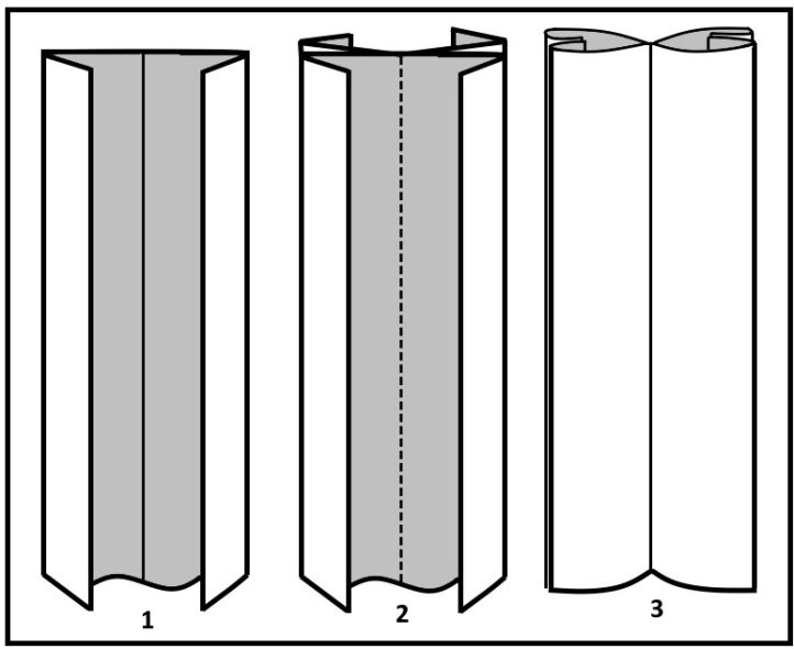 - Pressing the Edges: Place each long bias strip, right side down, on the pressing surface and center a 1 1/2” (3.8 cm) oak-tag pressing guide on top. Secure the ends of the oak-tag with a pin on each end to prevent slipping and fold the excess material over the long edges of the guide towards the center of the strip, without twisting the fabric. Press, with an up-and-down motion, along the folded edges. For longer lengths of bias trim, the fabric must be advanced on the pressing surface before proceeding and the method repeated for the new length and so on. Group bias strips in pairs and handle gently to not stretch the bias grain.