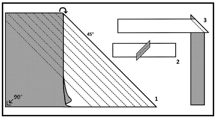 - Cutting On True Bias: Cloth strips and pieces cut on a true bias are frequently needed for finishes and trimming. Begin with a fashion fabric that has been squared and is on grain. To make a true bias, fold one corner of the cloth over so the length-wise threads of the goods exactly parallel the cross-wise threads. The 45 degree angle that is created in the true bias of the cloth. Then use a yardstick and chalk-wheel to mark the width of the strips you wish to cut parallel to the true bias, as shown in the diagram (1).