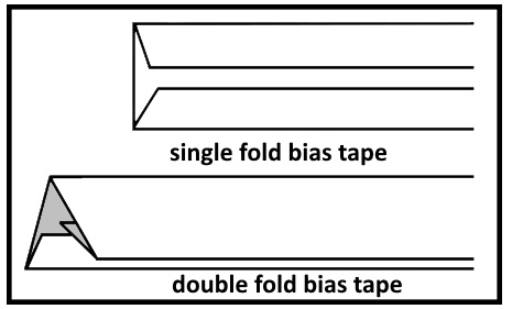 - Bias Binding: Commercially made bias binding is available in different widths ranging from about 1/4-inch (~ 6mm) to about 2-inch (50 mm) wide. Of course, if you make your own you can make any width you like. Bias binding comes in single fold bias tapes and double fold bias tapes. Single-fold means that the sides of the bias strip are folded towards the center and pressed to give it a clean edge on the bias strip. Double-fold means the bias strip is prepared like the single fold tape method, then the bias tape is folded over again in half so that turned edges meet and are pressed flat.