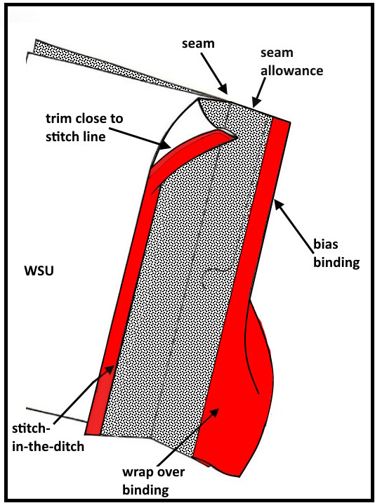 - Hong Kong Finish: Grade the seam allowances of the armscye, then wrap bias binding over the raw edge to the wrong side about 3/8” wide and press flat. From the right side, stitch-in- the-ditch along the bias seam to secure the binding. On the wrong side, trim away excess bias tape close to row of stitching to complete the seam finish. Press seam allowance to one side away from sleeve. Repeat method for other front section.