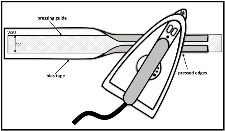 - Mark the Center Line: With wrong sides together (WST), fold strip in half length-wise and match up the sides of the bias strip to form a double fold bias tape. Lightly press with the tip of the iron to give it a clean edge on the bias strip, as shown in Diagram 1.