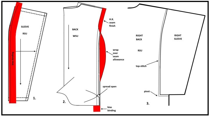 - Hong Kong Finish: Grade the seam allowances of the armscye, then wrap bias binding around the raw edge (about 3/8” in width) to the wrong side and press flat. From the right side, stitch-in-the-ditch along the bias seam to secure the binding. On the wrong side, trim away excess bias tape close to row of stitching. Press seam allowance to one side away from the sleeve.