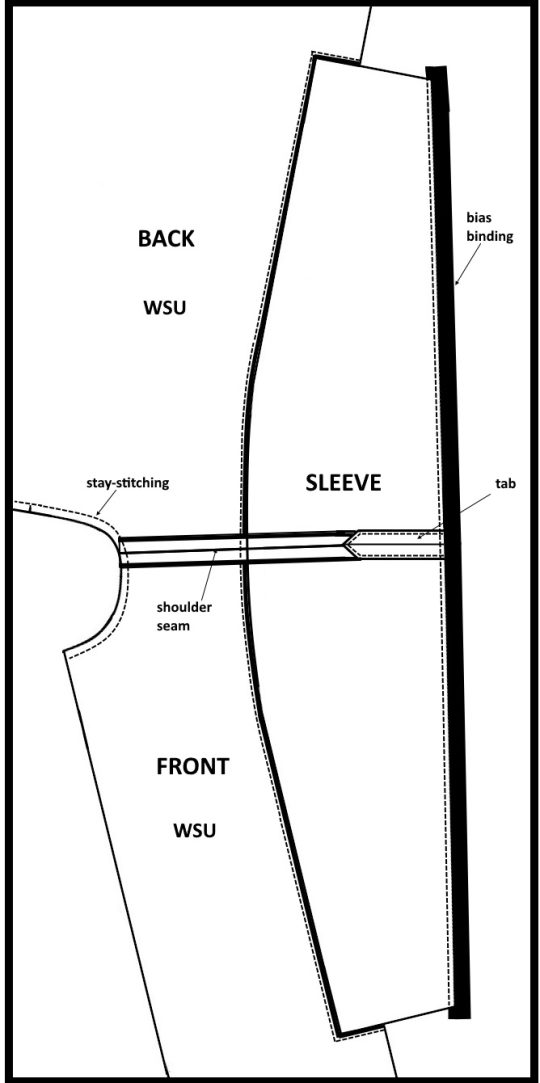 - Join Fronts to Back Section: With RST, match high shoulder point, armscye seam and end of sleeve. Pin/baste shoulder/sleeve seams of fronts to the back section together. Machine-stitch 3/4” seam allowance and press seam open.