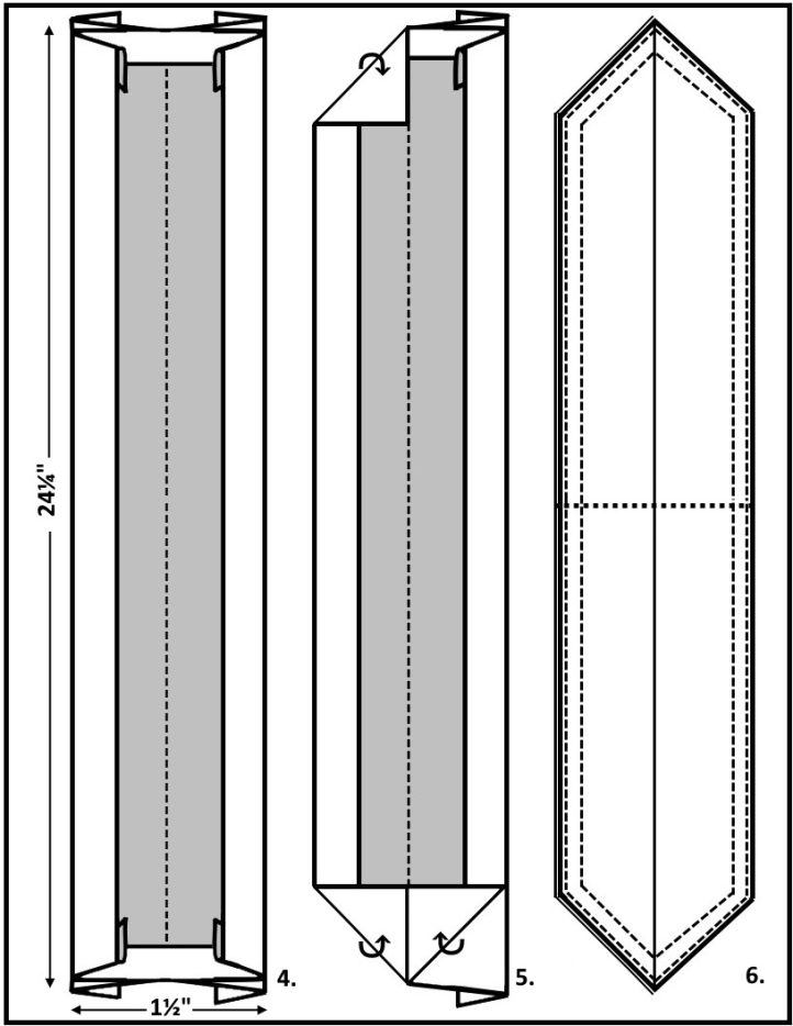 - Make Sleeve Tab: Select another pair of bias strips that are 2 1/2” (6.4 cm) wide. Cut a length of 25” (63 cm) long. Allowing for a 3/8” (10mm) at each short end, turn under seam allowances and press flat. Open the bias tape flat and with RST, lay one bias binding on top of the other. Align and match up their edges and pin together. Machine-stitch along the crease, back-tacking at each turned end (Diagram 4). With WSU (wrong sides up), fold the corners diagonally toward the center on both halves and press flat as shown in Diagram 5. Next, fold the ends WST to form half of an arrow. Repeat for the opposite side. Match up long edges and press flat. Double top-stitch along perimeter of sleeve tab, as shown in Diagram 6. Cut in half to make 2 sleeve tabs and set aside.