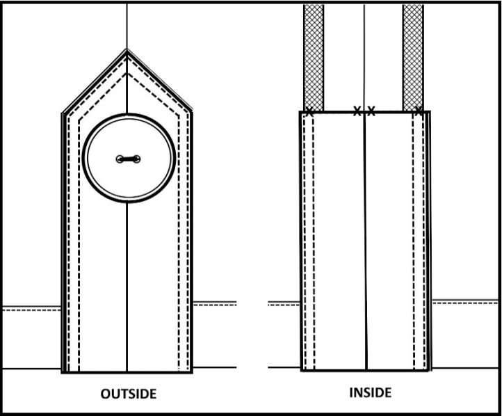 - Finish Sleeve Opening: Turn under seam allowance of bias trim and press flat. Fold bias trim in half and align turned edge onto the visible row of machine-stitching on the wrong side of the sleeve. Slip-stitch edge of bias trim to inside of sleeve opening. Wrap sleeve tab over bias trim and align point of sleeve tab to sleeve’s top seam, 4 1/2” (11.5 cm) from the opening. Secure in place with a button, sewing through all layers. On the inside of the garment, flatten any slack in the placement of the sleeve tab and tack it down to the seam allowance of the sleeve’s seam. Repeat for other side of the garment.