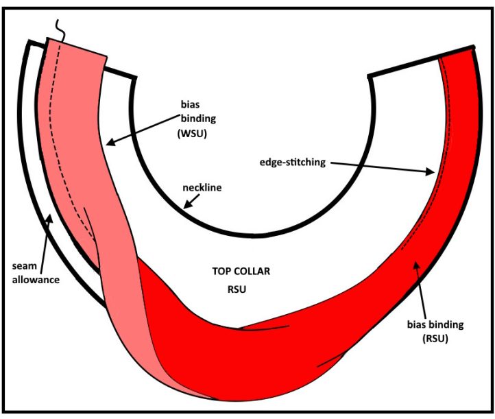 - Add Bias Trim to Top Collar: With RST, lay binding (1 1/2” wide) 3/8” from stitch line, easing bias binding in place as you go. Do not stretch bias binding: Sew binding flat, then fold the tape over so that it is face up and follows the shape of the outer edge. Press flat and baste trim to collar’s seam allowance. Trim away any excess material if needed. With RSU, edge-stitch outer edge of trim.