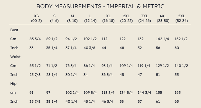 Start by taking your body measurements. Measure the circumference of your bust, waist, and hips by pulling the measuring tape snugly; it should fit tightly around your skin but not too tightly. Measure directly over bare skin or typical-for-you undergarments. Keep the tape parallel with the floor, and ensure it is not twisted. Compare your measurements to the “body” measurements in the chart above to see your recommended size.