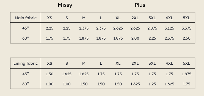 FABRIC REQUIREMENTS – YARDAGE: