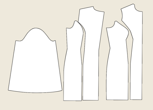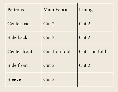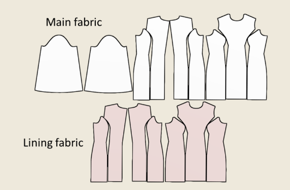 The lining patterns can be traced off from the main pattern, stopping at the line labeled lining hem. You can also fold or trim at the line labeled lining hem to get the pattern pieces for the lining after cutting out the pattern pieces on the main fabric.