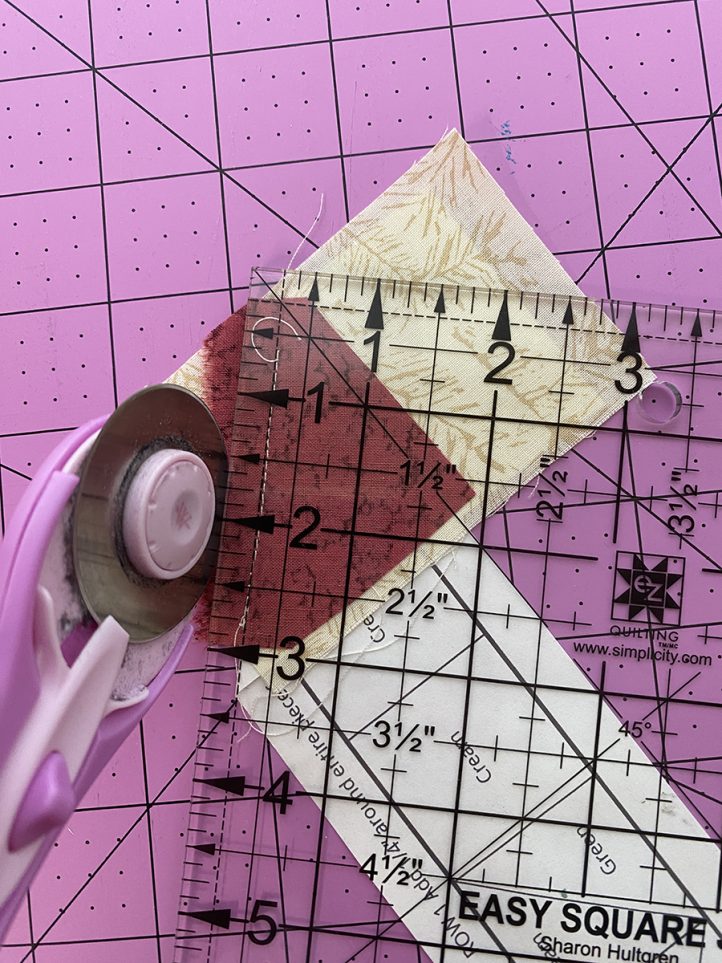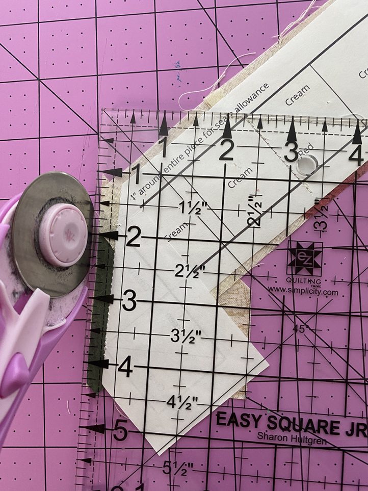 - Fold the pattern onto itself at the line you just stitched. Use a ruler to make a 1/4” seam allowance from the stitched line and trim away excess. Press.