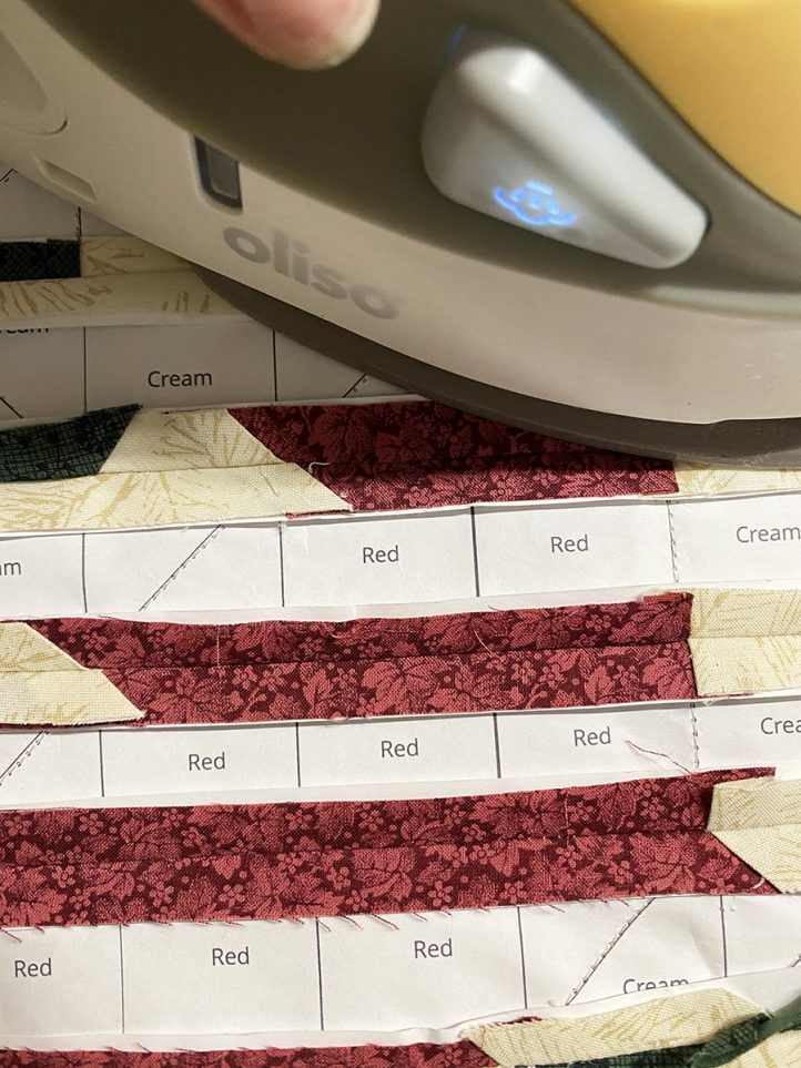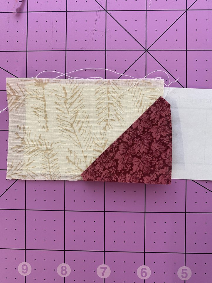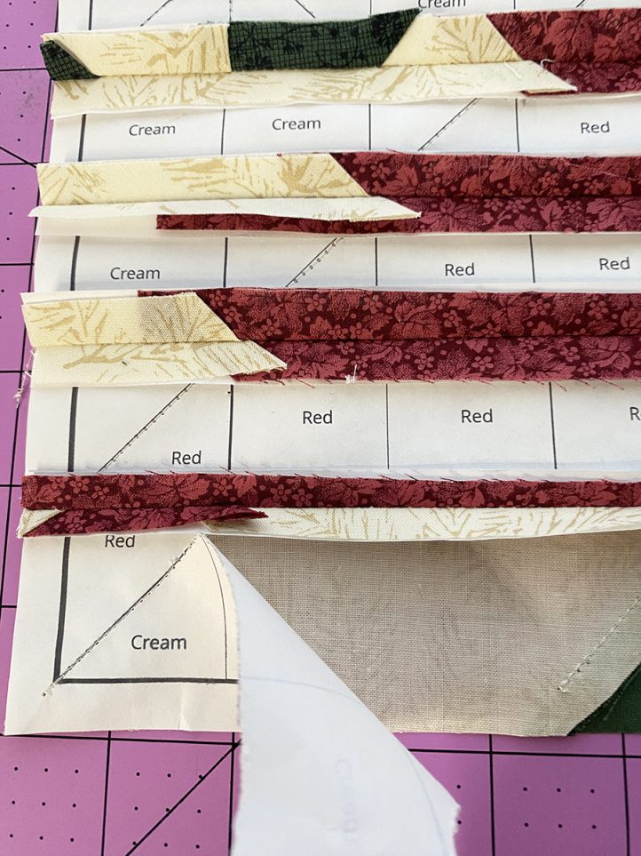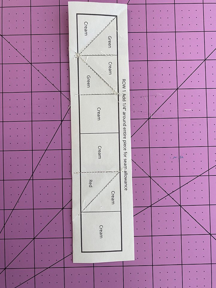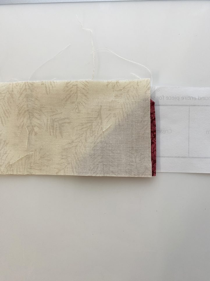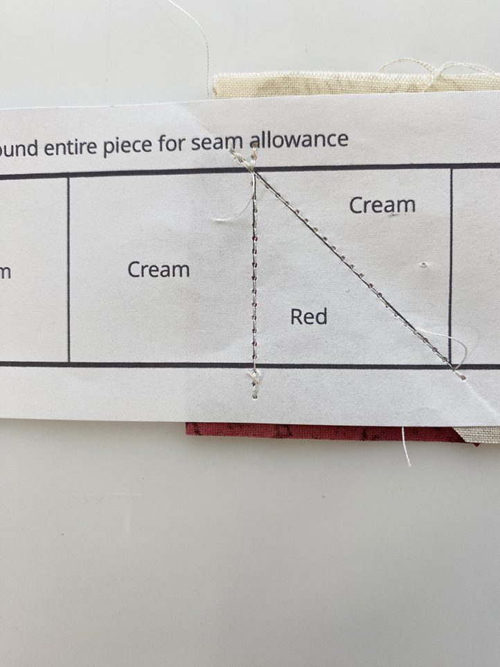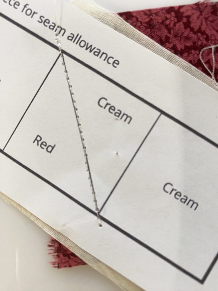 - Stitch on the printed side of the pattern over the line between the Cream and Red.