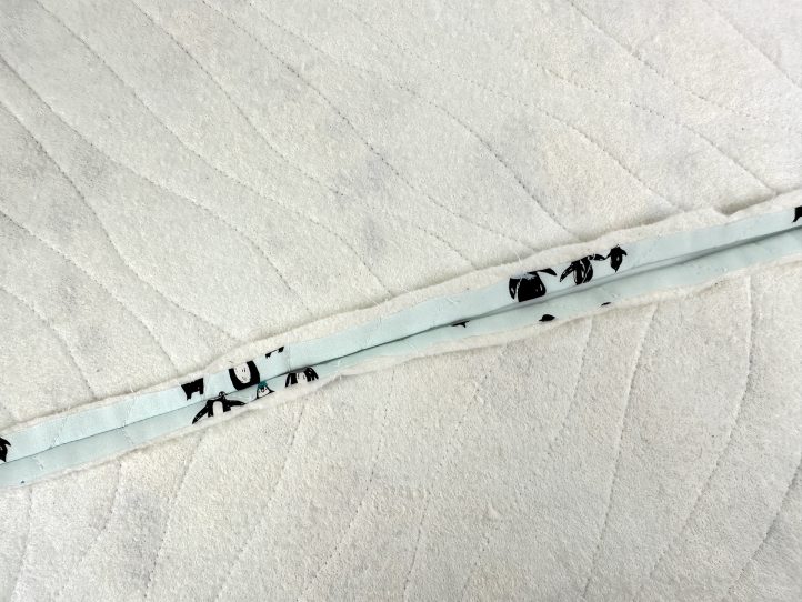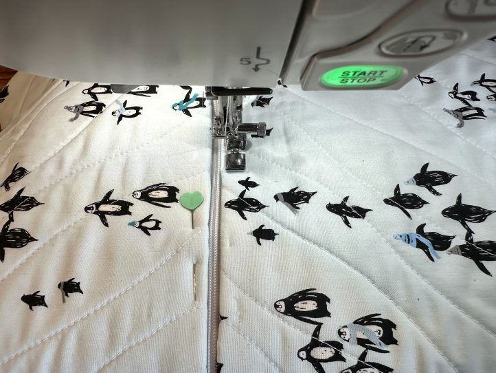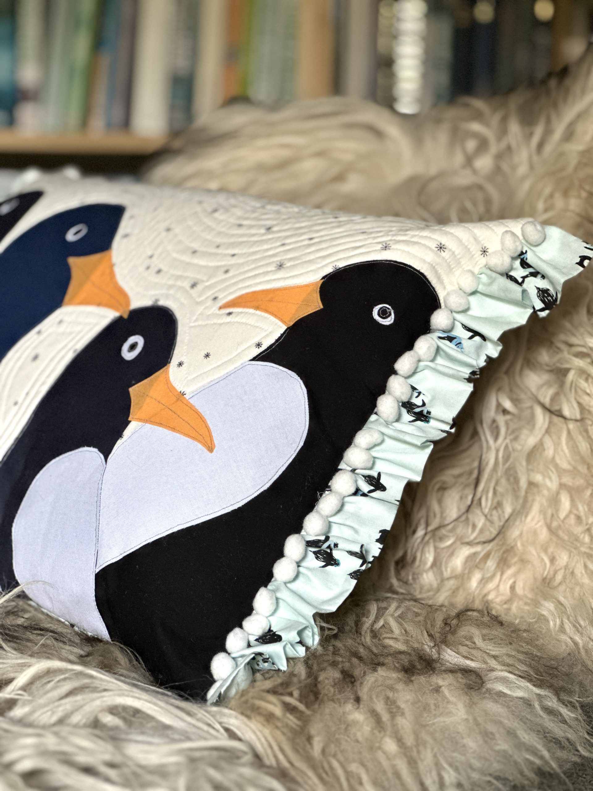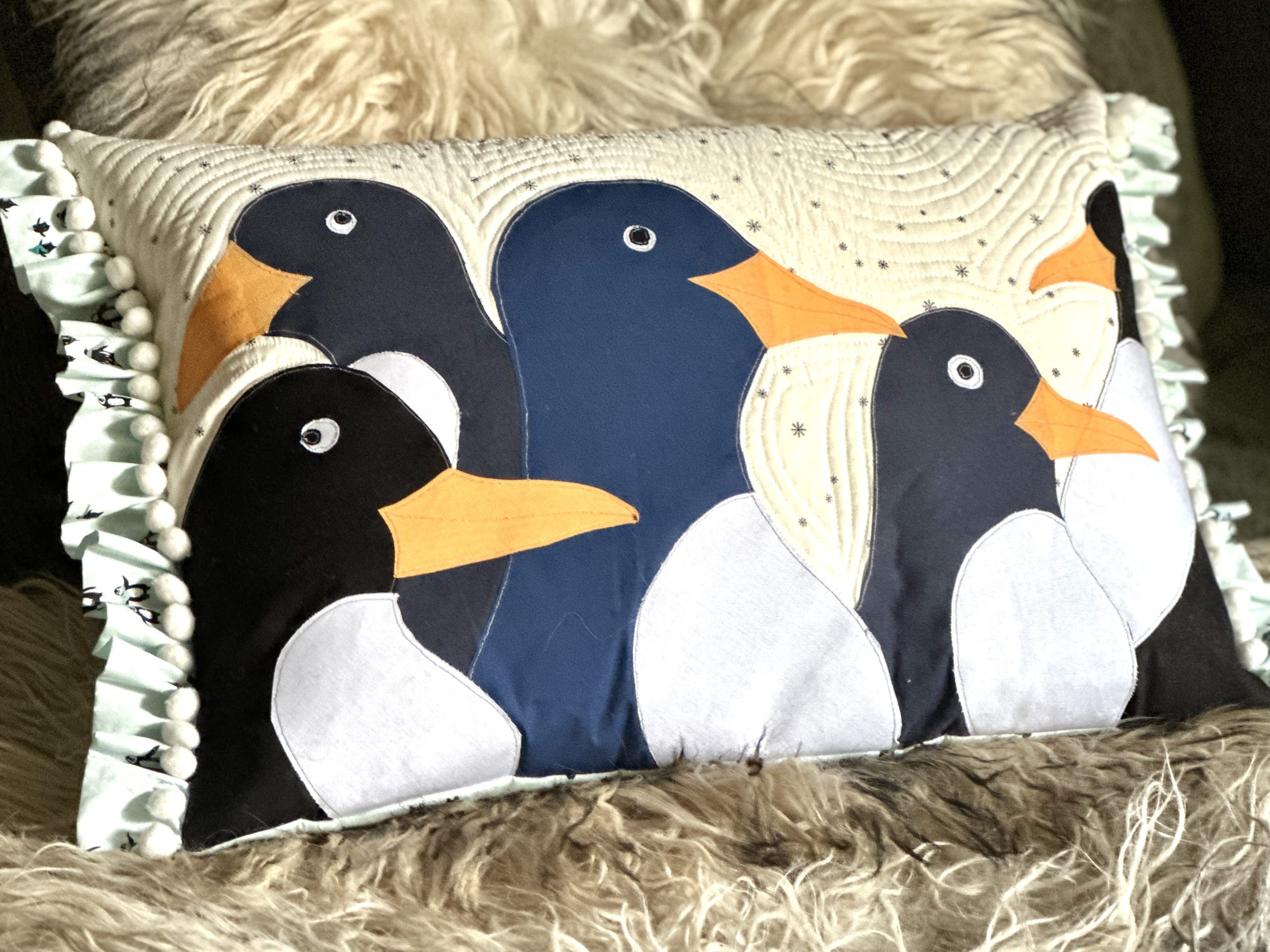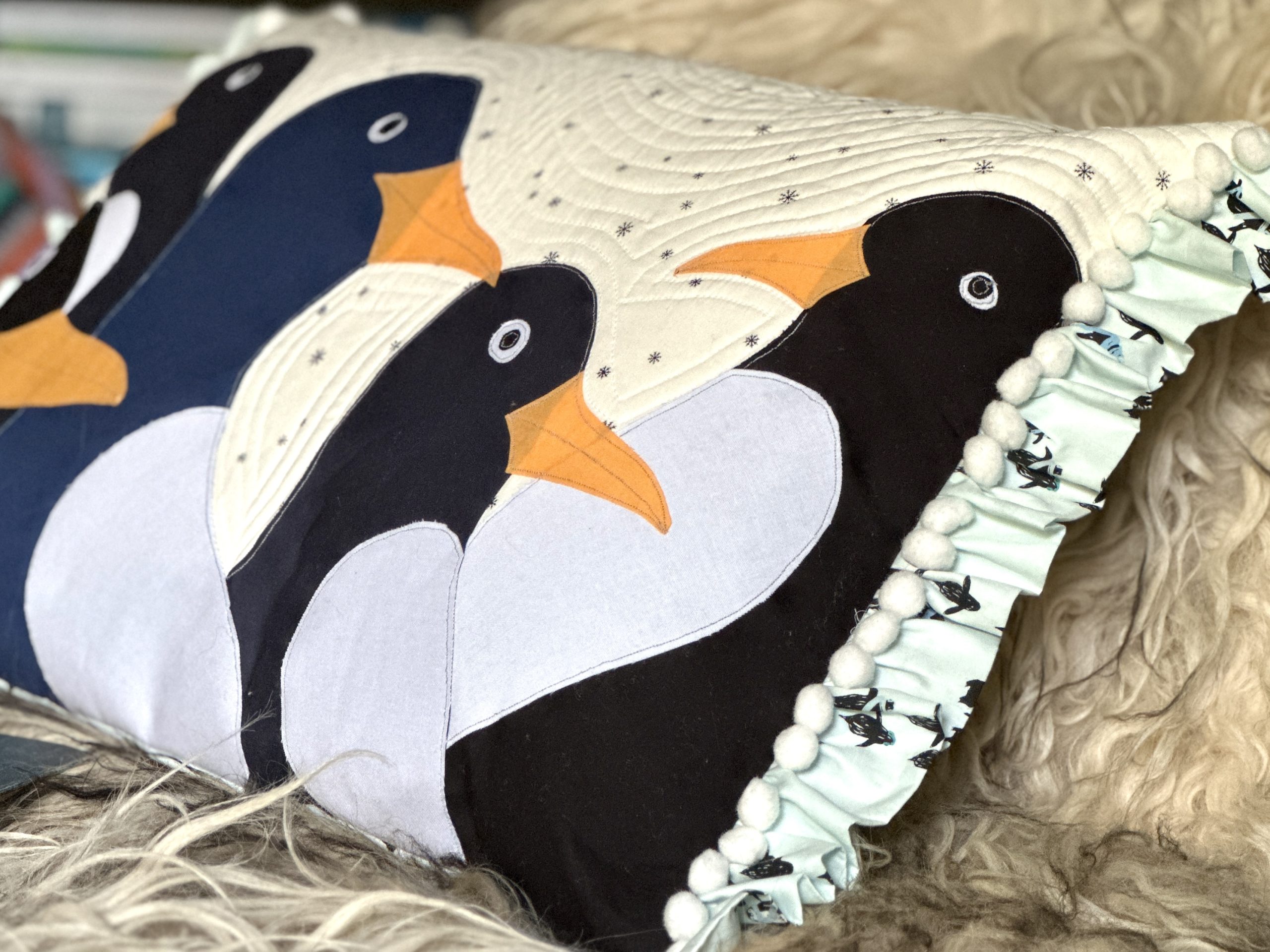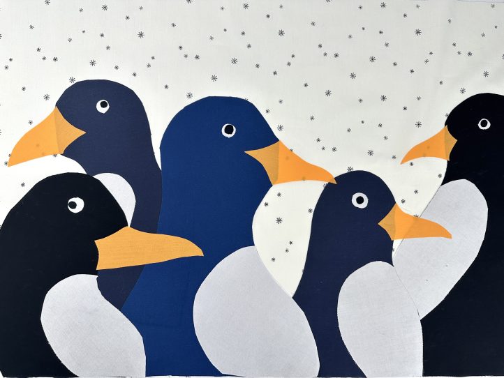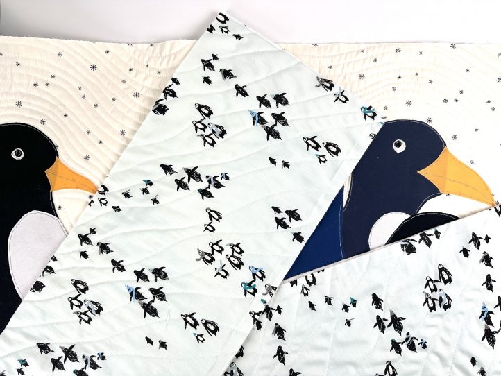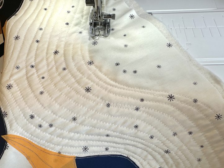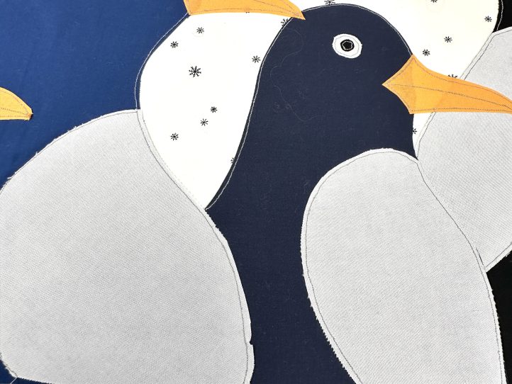 - Quilt the front slightly differently by following the contours of the penguins on the snowflake fabric only.