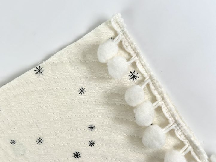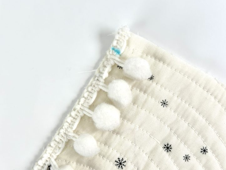 - TIP: Use your zipper foot to get in nice and close to the pompoms without them getting tangled in the foot. This trim does stretch a bit, so you might have to remove more pompoms.