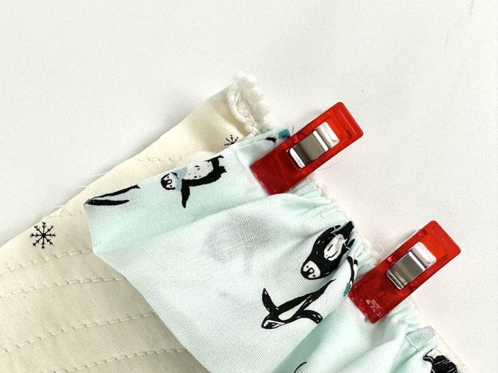 - Lay the penguin top panel right side up onto its piece of batting and pin. Lay the other two pieces onto theirs as well and pin those, too. Swap to the walking (dual feed) foot.