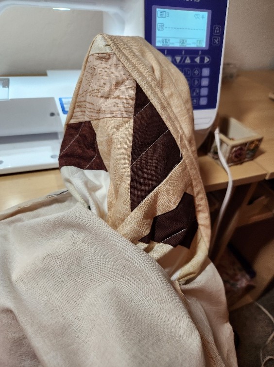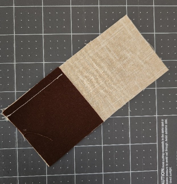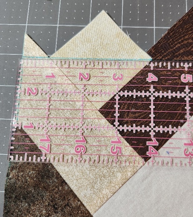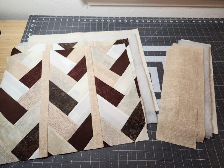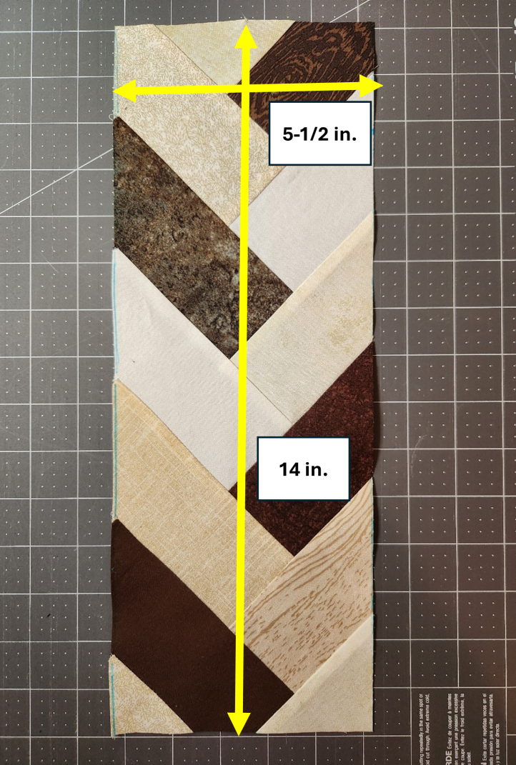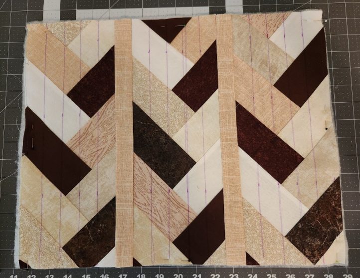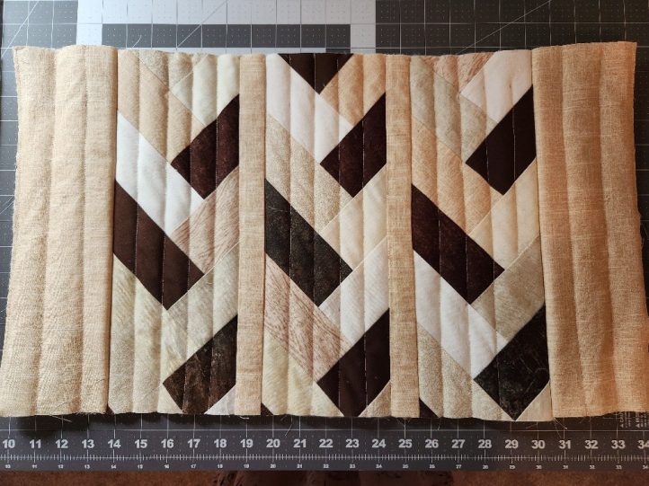 - Continue to add strips in this manner until there are 6 on each side, with every third strip being a darker brown to add variety and balance to the layout. Press seams downward.