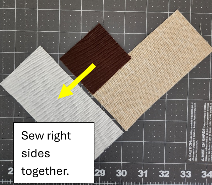 - Sew the top edge of the right strip to the bottom right edge of the square, right sides together.