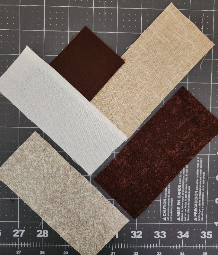 - Cut strips for braided sections: If using yardage, cut 2 strips each 2-1/2 in. wide from each of the six neutral fabrics. Cut each strip into pieces measuring 2-1/2 in. x 5-1/2 in. Cut a total of 12 pieces of each color.